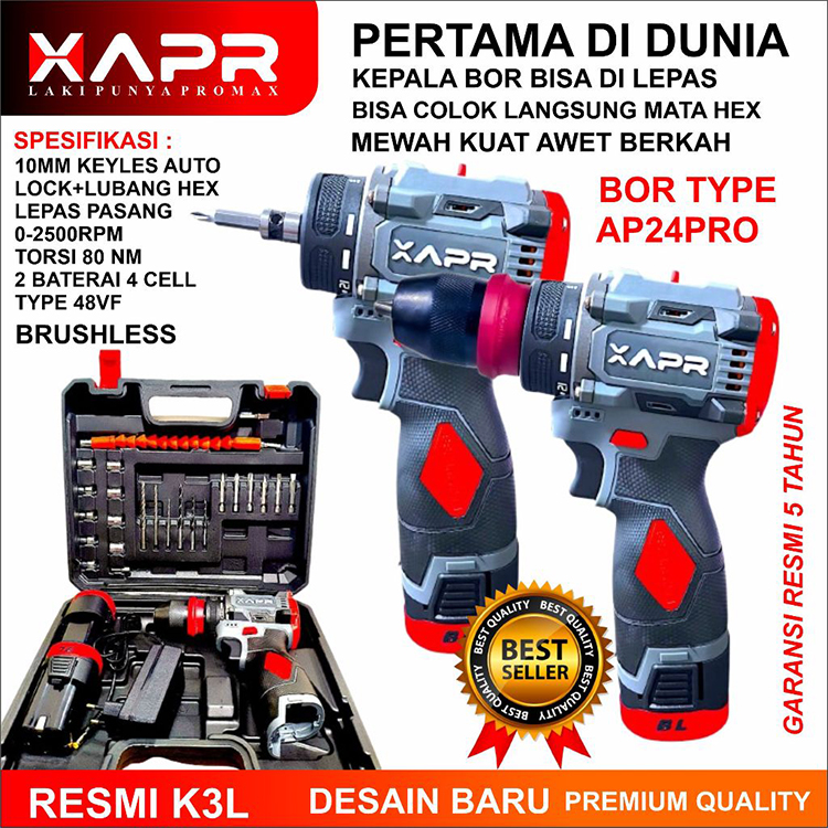 BARU APR bor brushless driver 10mm keyless auto lock type AP24PRO fullset accecoris mesin bor cordless 2 baterai TYPE 48