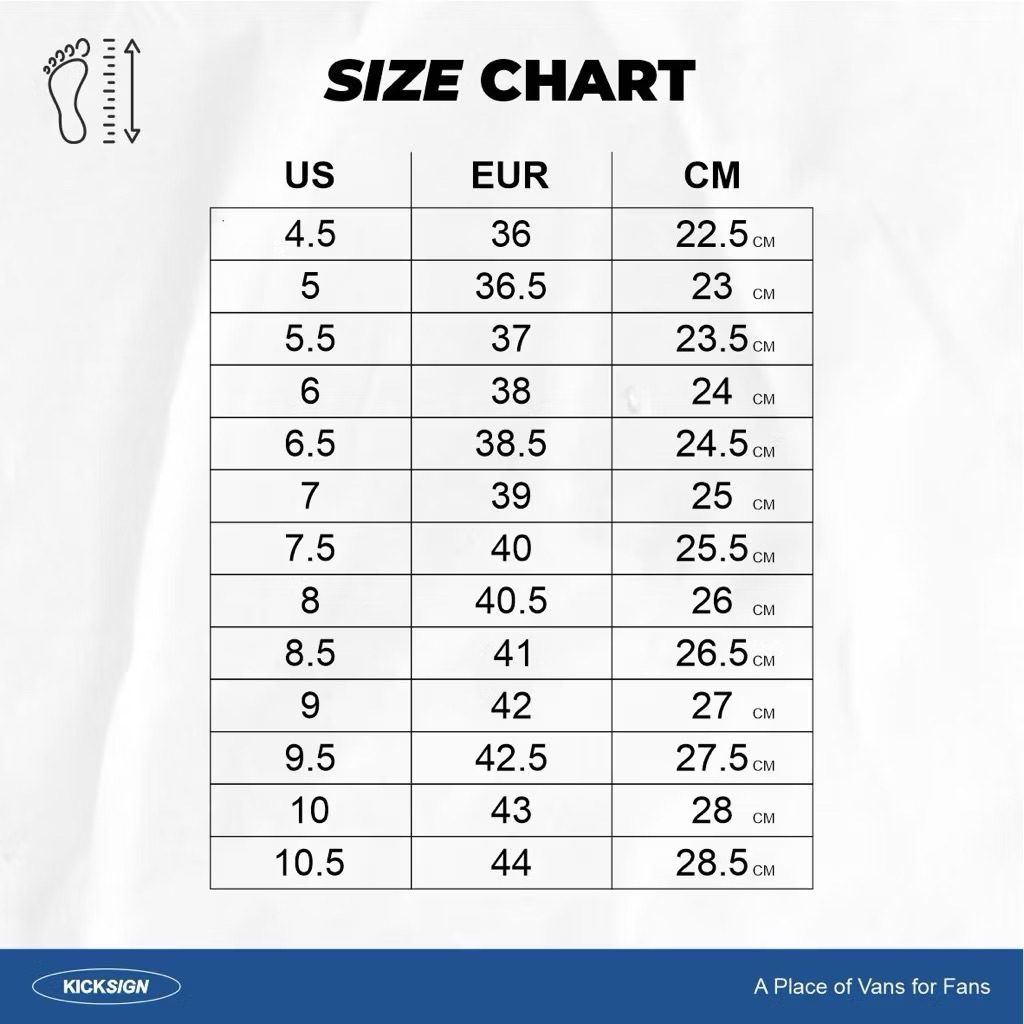 36 EUR / 22.5 CM, 36.5 EUR / 23 CM, 37 EUR / 23.5 CM, 38 EUR / 24 CM, 38.5 EUR / 24.5 CM, 39 EUR / 25 CM, 40 EUR / 25.5 CM, 40.5 EUR / 26 CM, 41 EUR / 26.5 CM, 42 EUR / 27 CM, 42.5 EUR / 27.5 CM, 43 EUR / 28 CM, 44 EUR / 28.5 CM