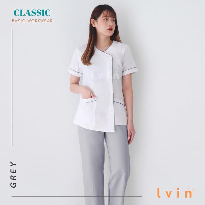 Baju Seragam Suster Lvin New Classic Putih / Seragam Suster Lengan Pendek / Seragam Klinik Oka / Seragam Perawat - San