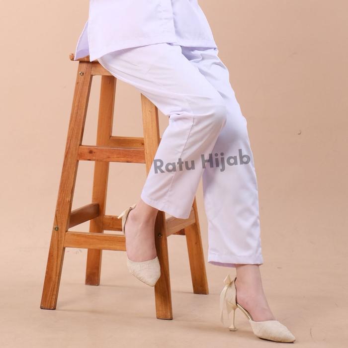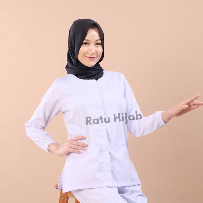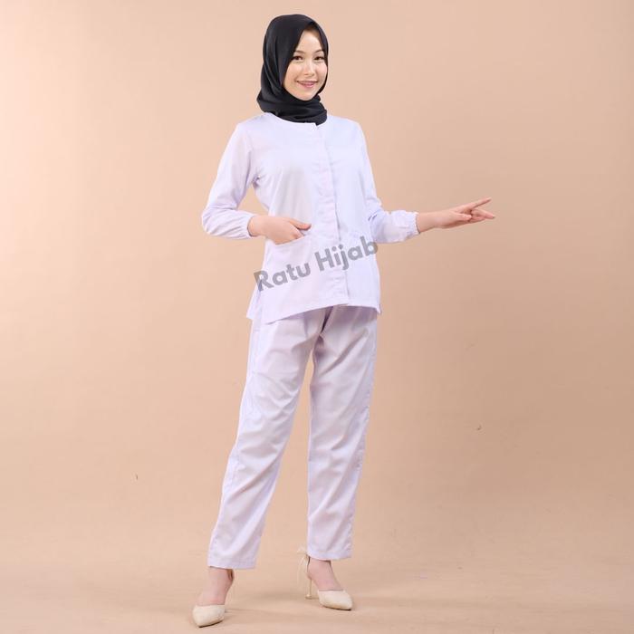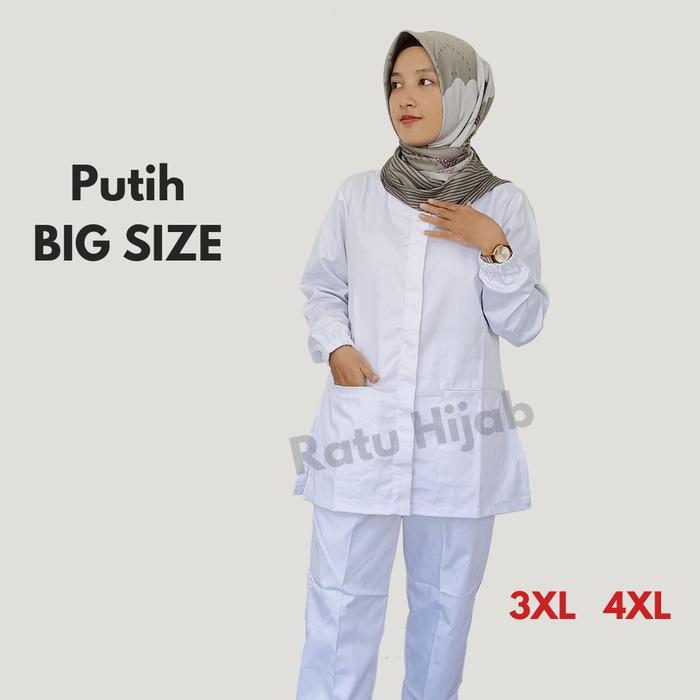 Baju Perawat Putih Big Size Wanita Lengan Panjang Dokter Petugas Nakes Bahan American Drill Celana Kerja - Full Kancing