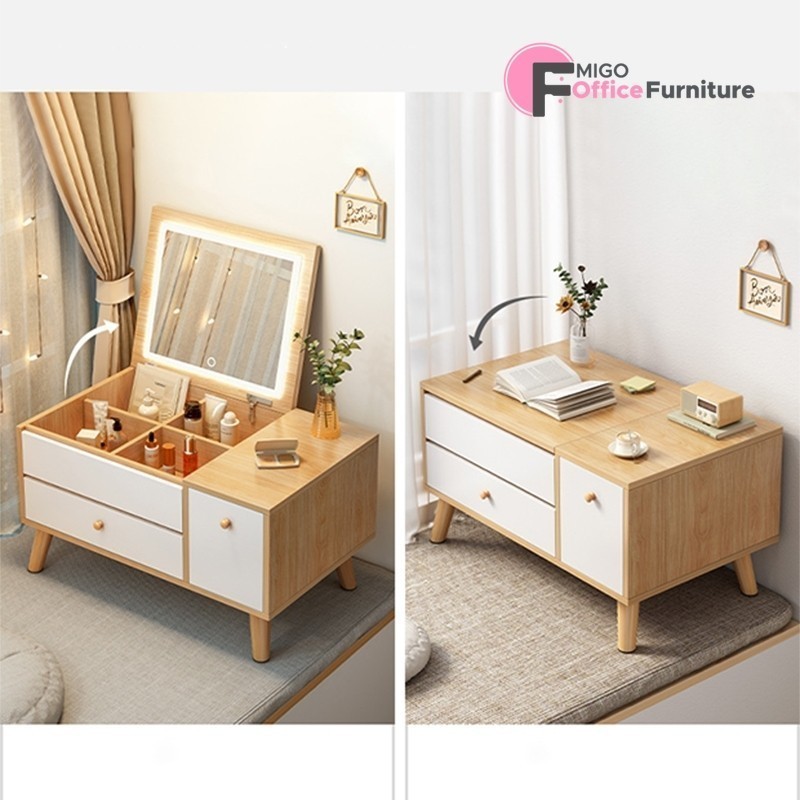 Meja Rias Minimalis Makeup Best Seller Modern Lampu LED Kursi Pita Homedoki Plastik Kayu Jati Gantung Dinding