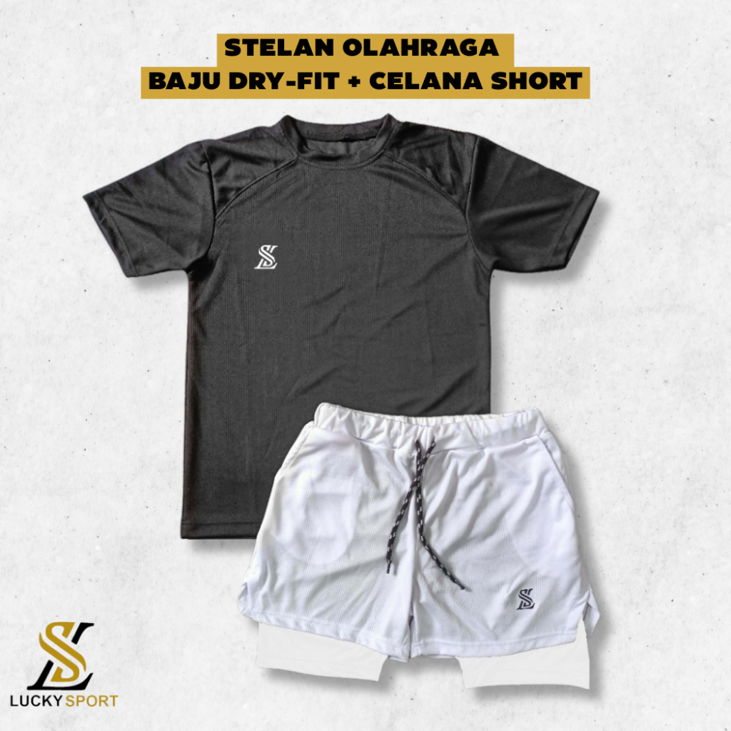 Setelan Olahraga Pria Double Layer 1 Set Baju Kaos Dryfit Celana Pakaian Outdoor Running gym lari Badminton Volly Futsal