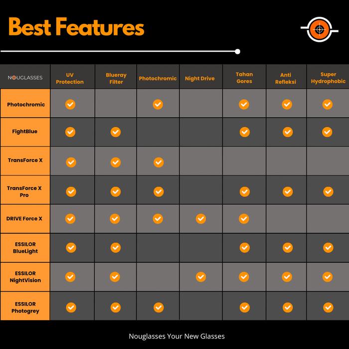 DRIVE Force X, ESSILOR BlueLight, ESSILOR NightVision, ESSILOR PhotoGrey, Fight FOG X, FightBlue, Photochromic, TransForce X Pro, TransForceX