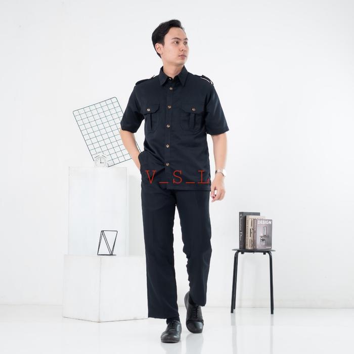 Seragam Safari Setelan Lengan Pendek Security Guru Pns Satgas Driver Baju Celana - Hitam Baju+Celana, M