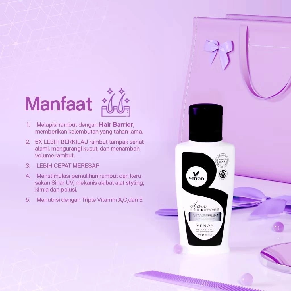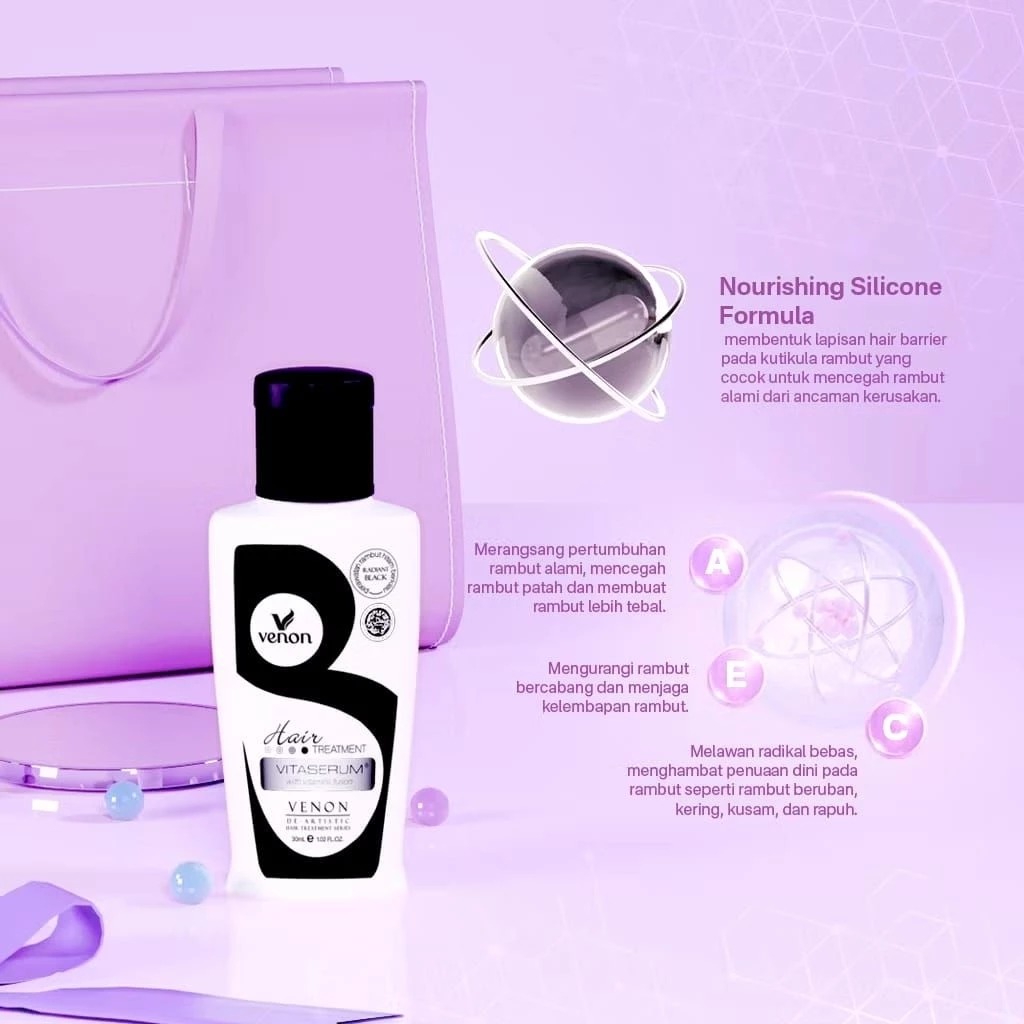 Paket Bundle Isi 12pcs VENON 2in1 Vitaserum Hair Serum + Vitamin Rambut E , A , C 30ml Perawatan Rambut Radiant Black