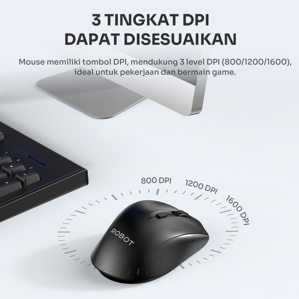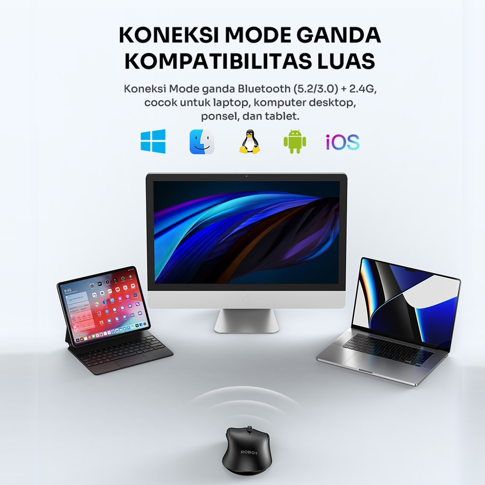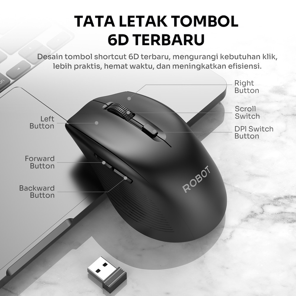 Mouse Wireless ROBOT Dual Mode Mouse M530 Koneksi Bluetooth Silent Click 1600DPI 6 Tombol Receiver USB Bluetooth PC