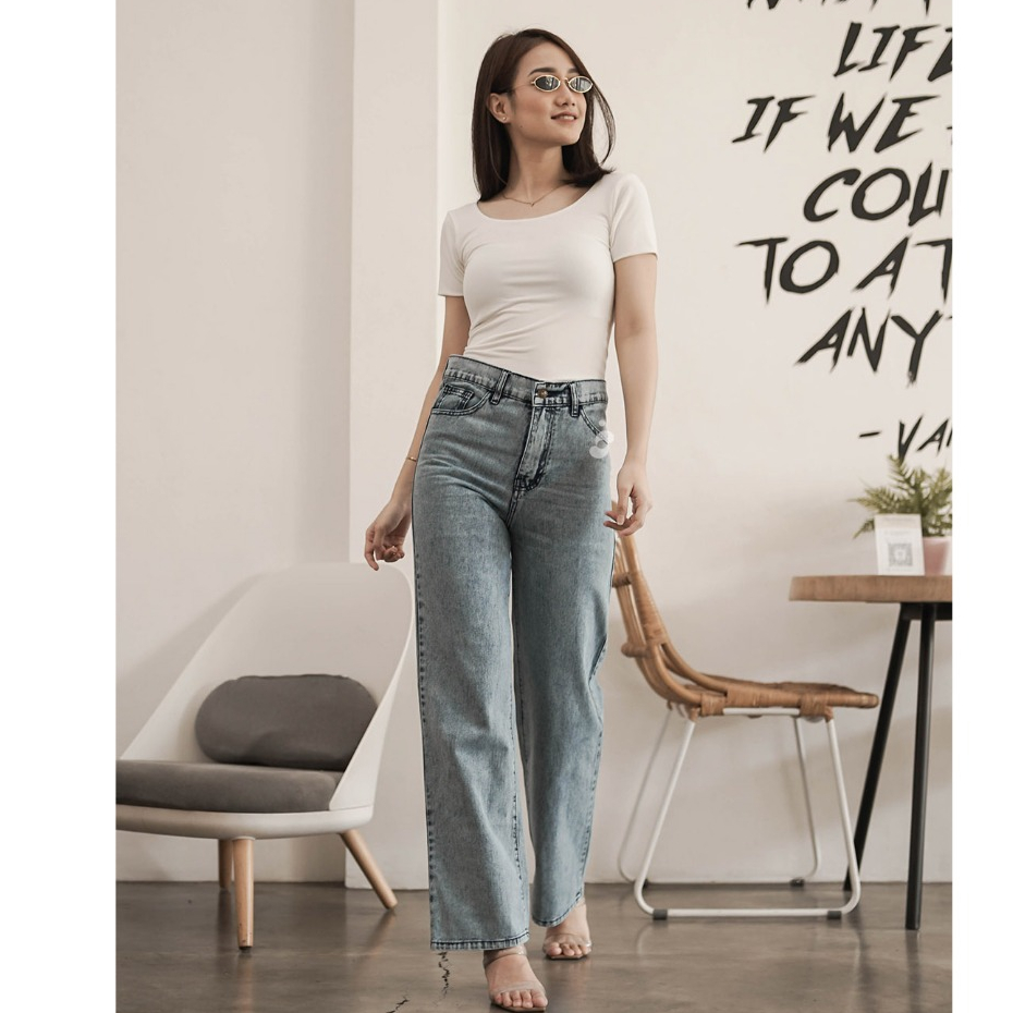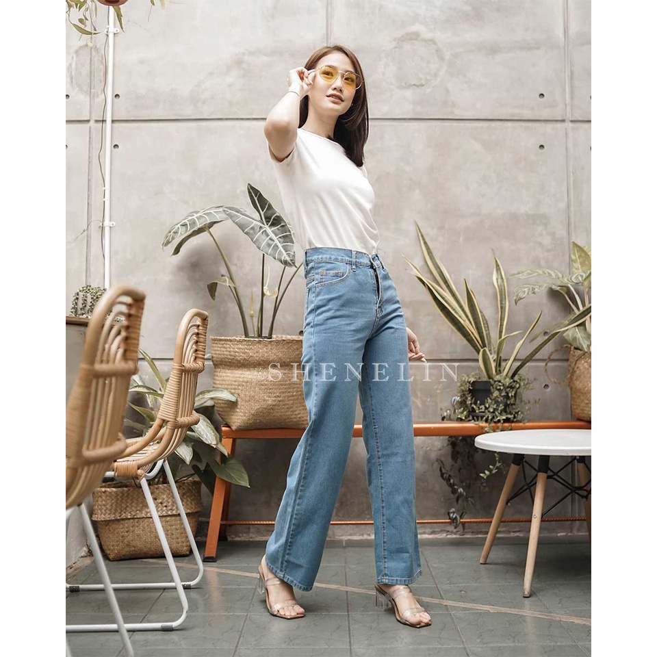Shenelin celana panjang jeans wanita kekinian denim biru putih hitam black white denim Signature Highwaist Loose.