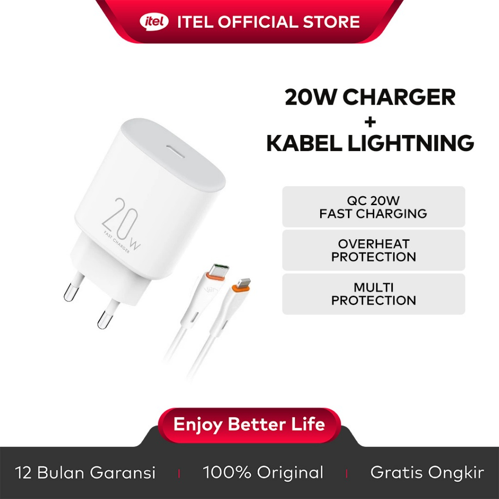 Itel 20W Kepala Charger Kabel Iightning type-iphone Fast Charging ICW-202EL Travel Adapter White kepanjangan 1meter