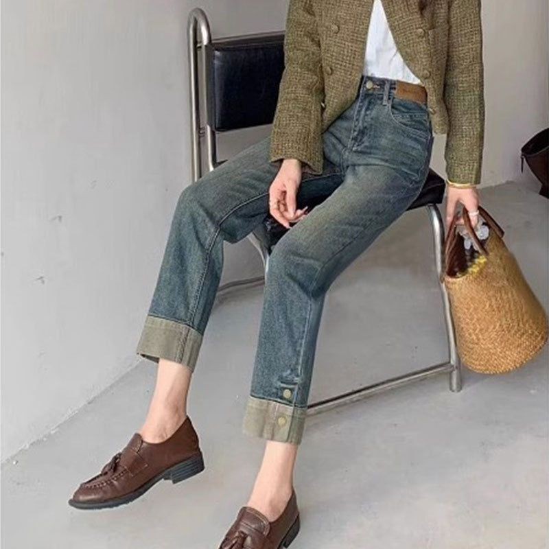 MFM 8034 Celana Jeans High Waist Jeans Kulot Highwaist Stretch Denim Kaki Lipat Jeans Variasi Kancing Panjang 7/8 Biru Retro Jeans