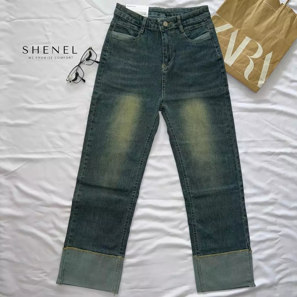 Shenel | Jeans High Waist Wanita Stretch Jeans Kulot Hailey Biru Retro Denim Cropped Pants Kaki Lipat