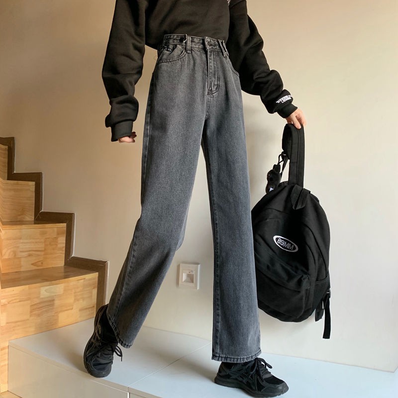 jeans high waist wanita korea style celana kasual loose abu-abu gelap