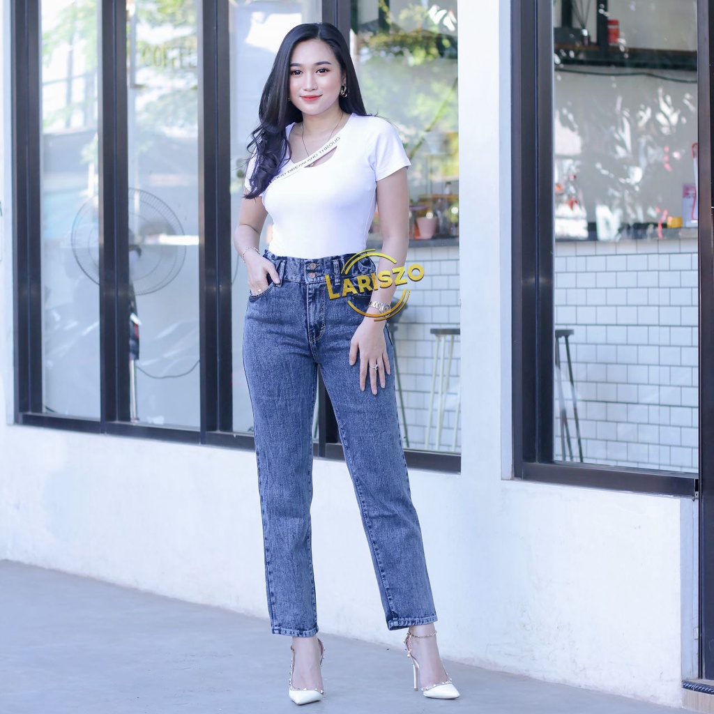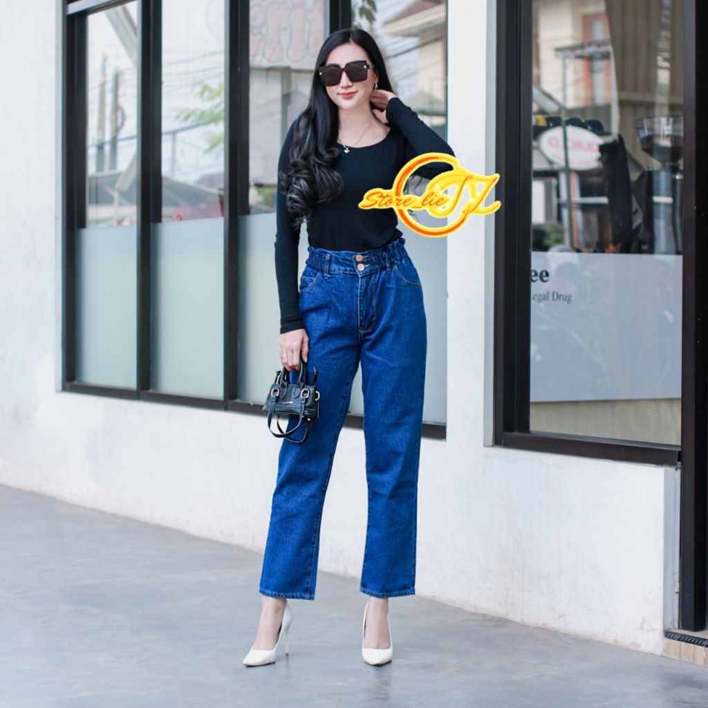 Boyfriend Higwaist Jeans Pinggang Karet Kerut Kancing 2 Celana Jeans Wanita Kekinian Real Pict