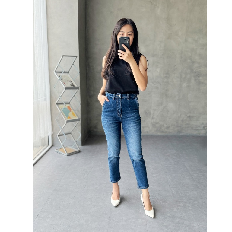 Shenelin Celana Jeans Wanita Boyfriend Highwaist Stretch Jumbo Biru Tua Medium Blue Hitam Wash Ankle Fit