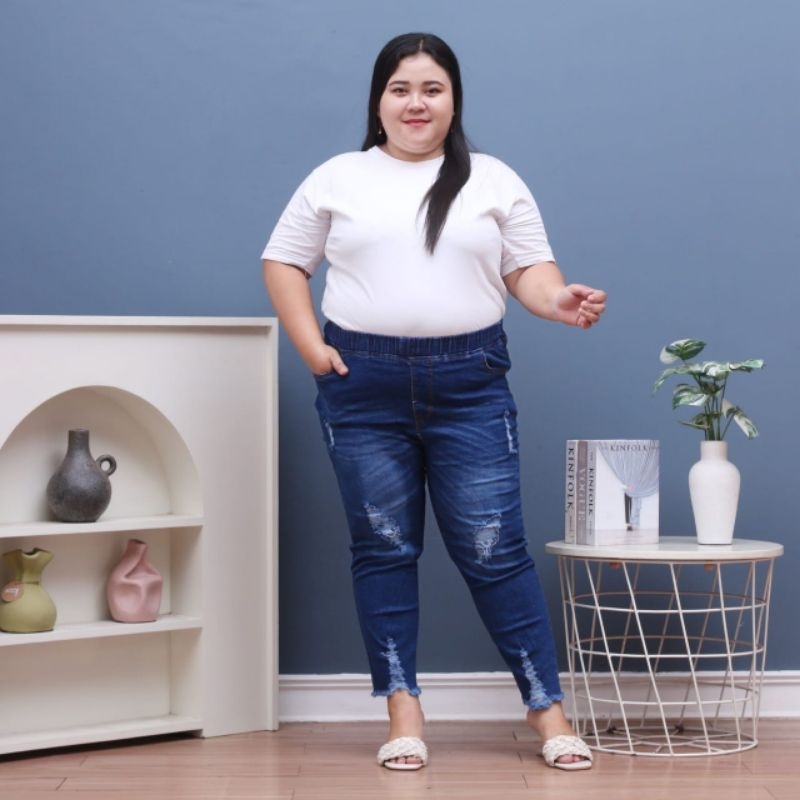 celana jeans wanita jumbo sobek / celana pinggang karet street / jeans ripped terbaru