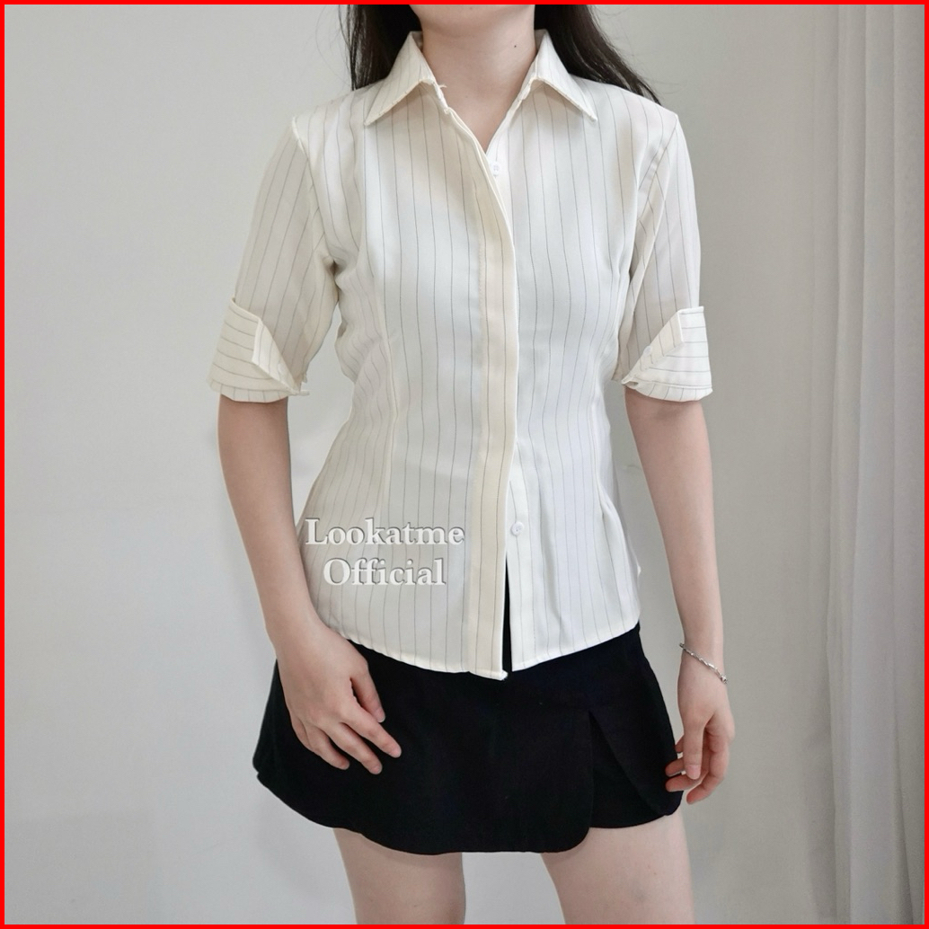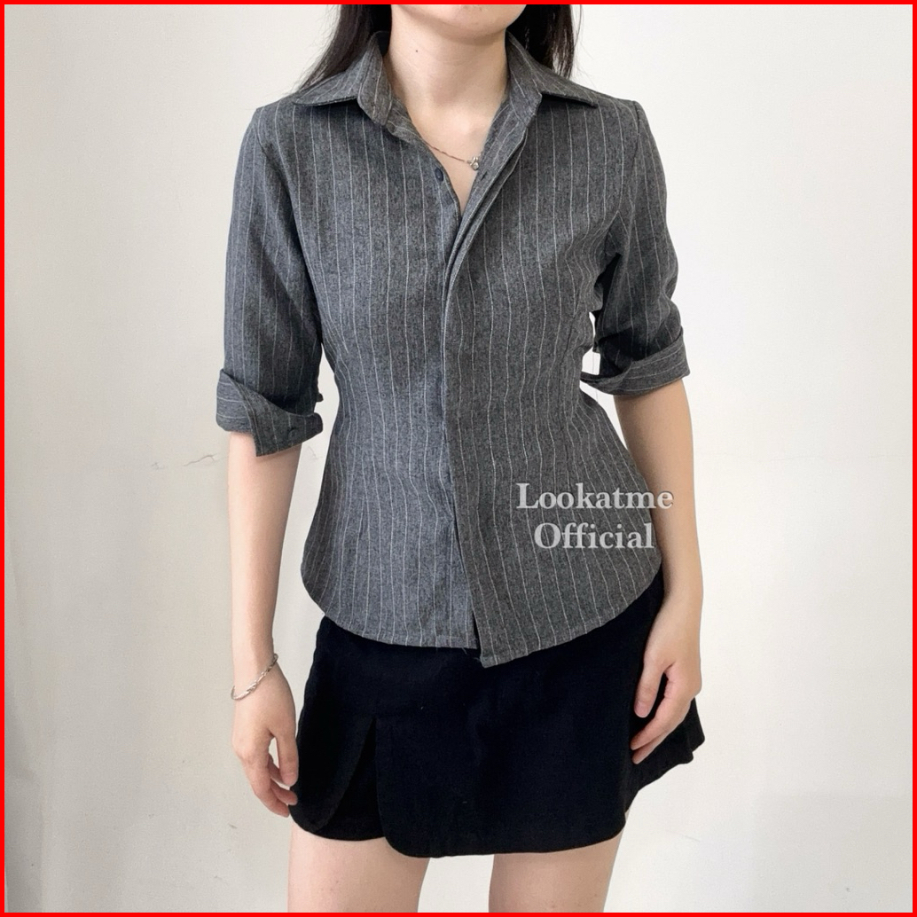 Haven Shirt - Atasan Kemeja Stripe Salur Wanita Lengan 3 4 Fitted Kerah Vneck Baju Wanita Formal Kantor Kerja Office Loo