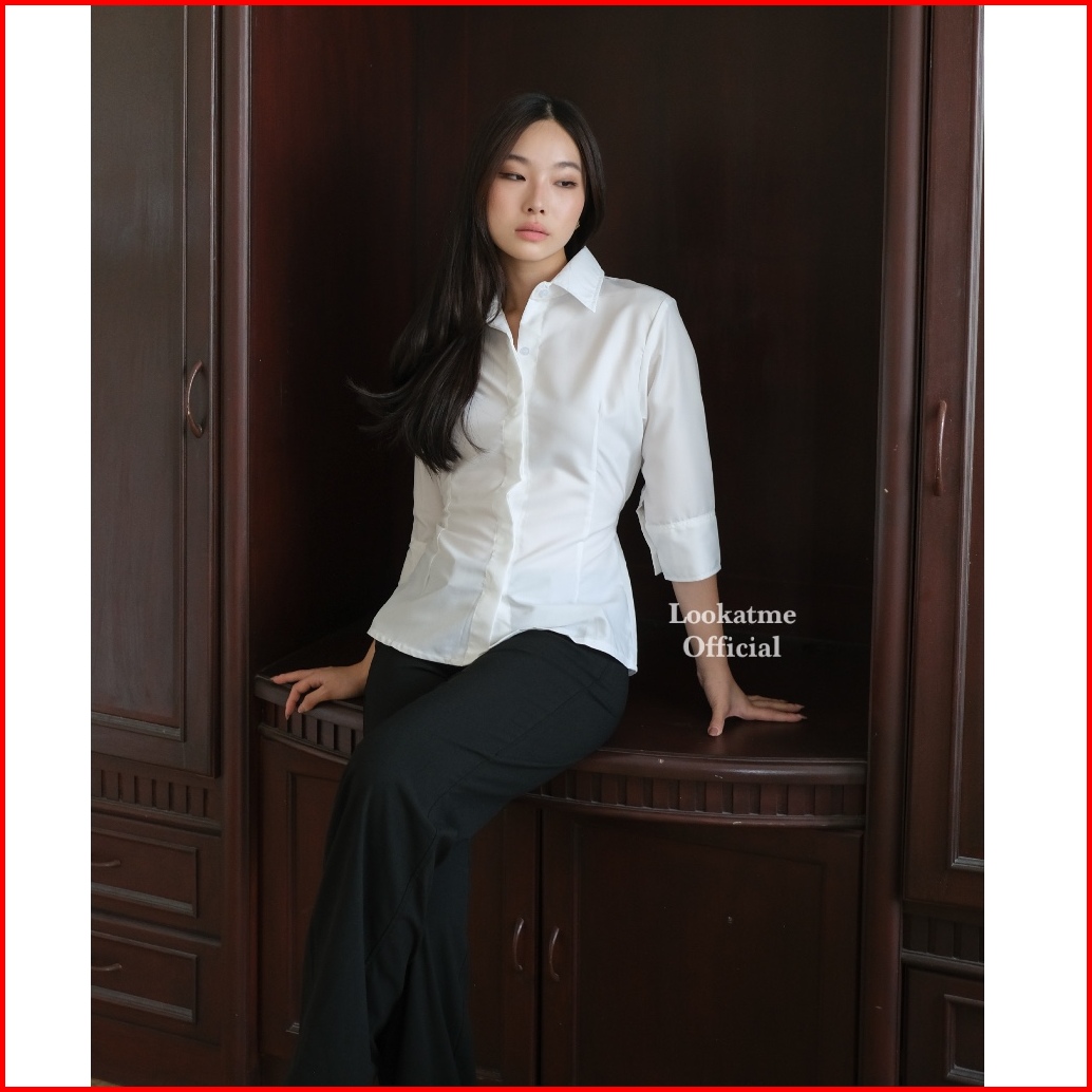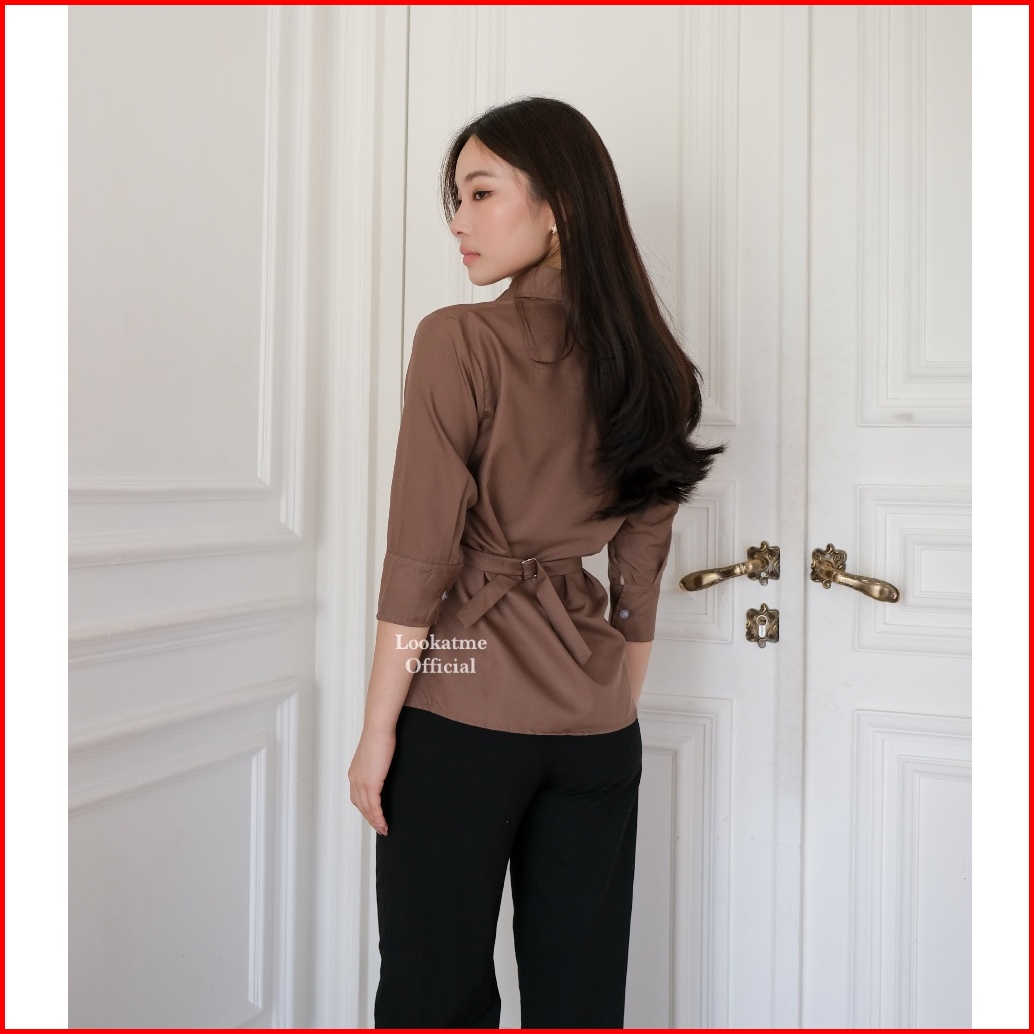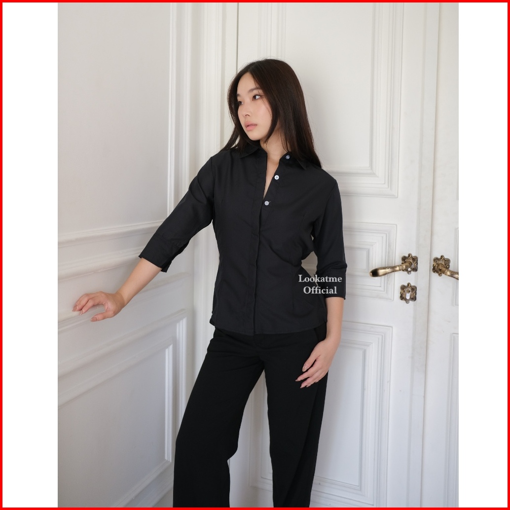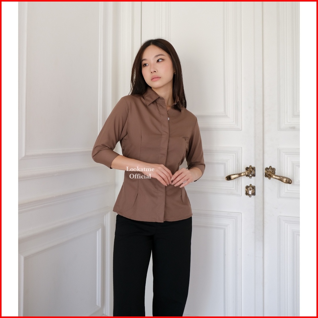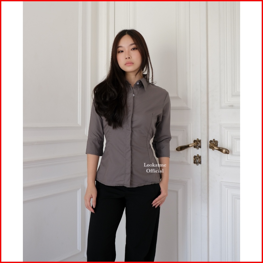 Hazel Shirt - Atasan Kemeja Wanita Slim Fitted Body Lengan Panjang 3 4 Basic Polos Casual Kerja Kantor Bahan Cotton Popl