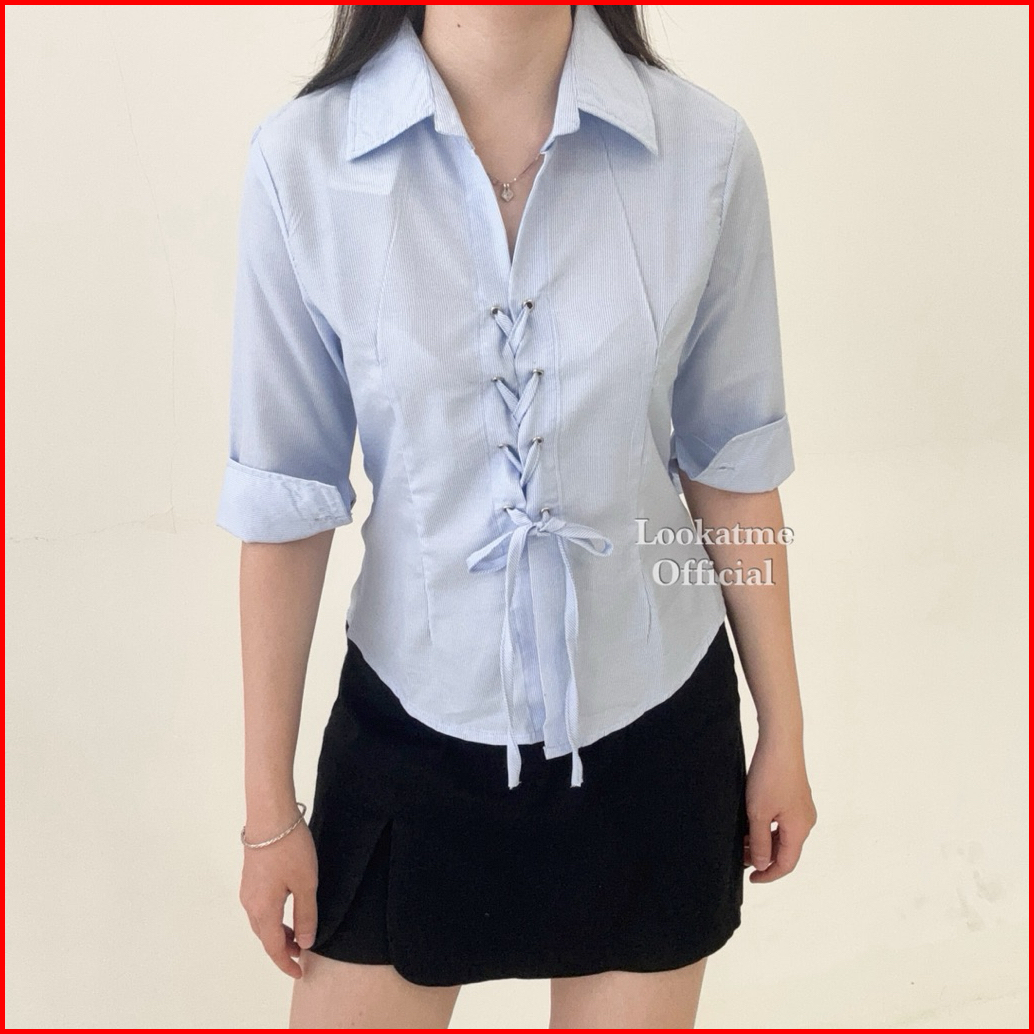 Alice Shirt - Atasan Kemeja Fitted Stripe Salur Wanita Kerah Vneck Lengan 3 4 Formal Look Bahan Cotton Adem Nyaman