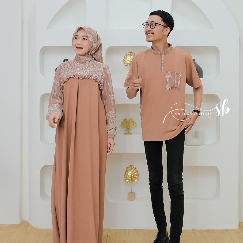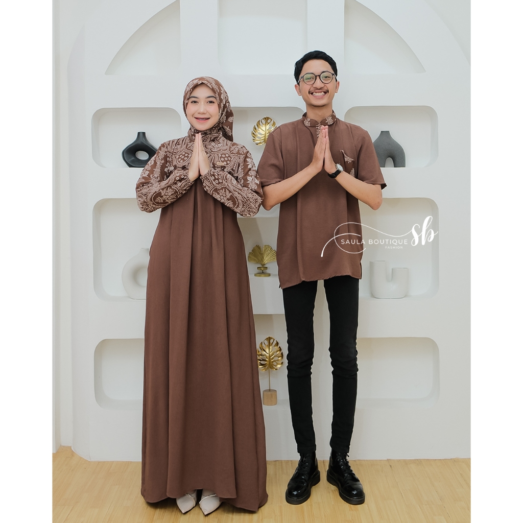 Ready Couple Set Gamis Kanaya dan Kemeja Keenan PO Pengemasan Bahan Cringkle mix Ceruty Printing Motif Terlaris- Baju Couple Lebaran - Sarimbit Set Gamis dan Koko - Dress Couple Free Hijab