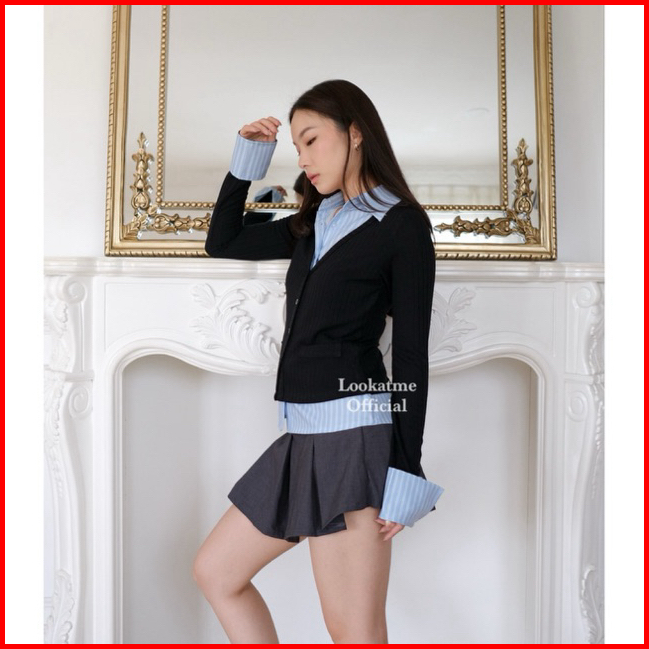 Odette Top - Atasan Kemeja Wanita Stripe Layer Collar Shirt Baju Slim Fit Lengan Panjang Korean Look Vintage Mewah Class