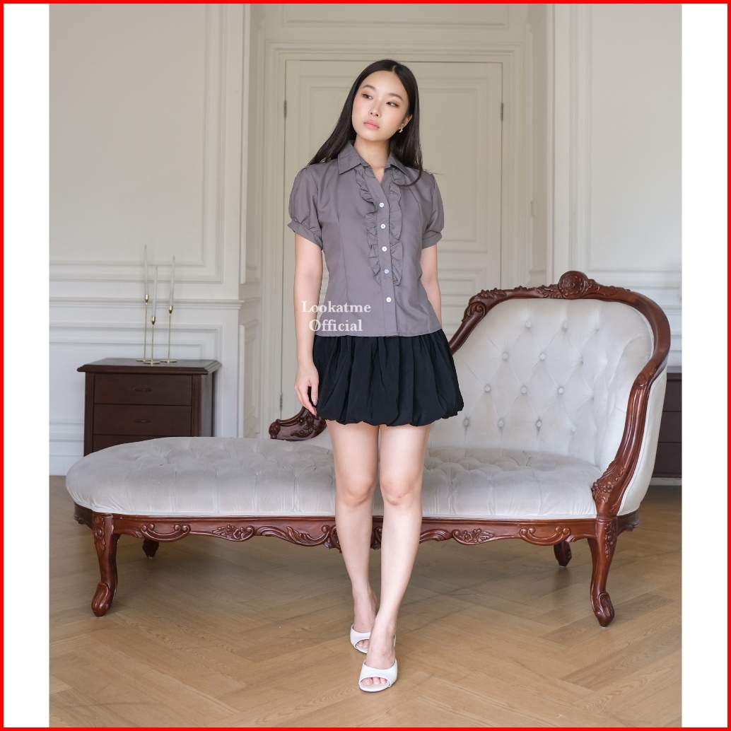Carly Shirt - Atasan Kemeja Fitted Body Wanita Korean Look Lengan Pendek Balon Baju Casual Kerja Vintage Look