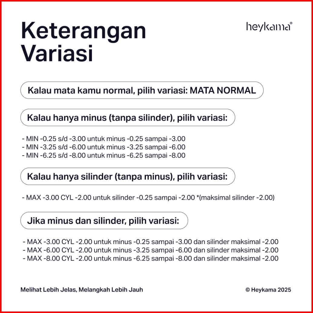 Mata Normal, MIN -0.25 s/d -3.00, MIN -3.25 s/d -6.00, MIN -6.25 s/d 8.00, MAX -3.00 CYL -2.00, MAX -6.00 CYL -2.00, MAX -8.00 CYL -2.00