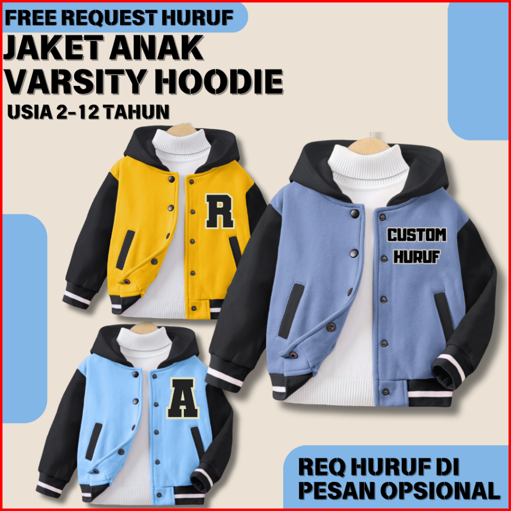 Jaket Custom Huruf Anak Varsity Hoodie Usia 2-12 Tahun
