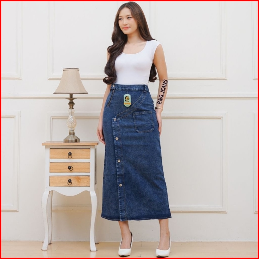 Pg Jeans - Nikita Rok Jeans Skirt Panjang Wanita Kancing Karet Belah Depan