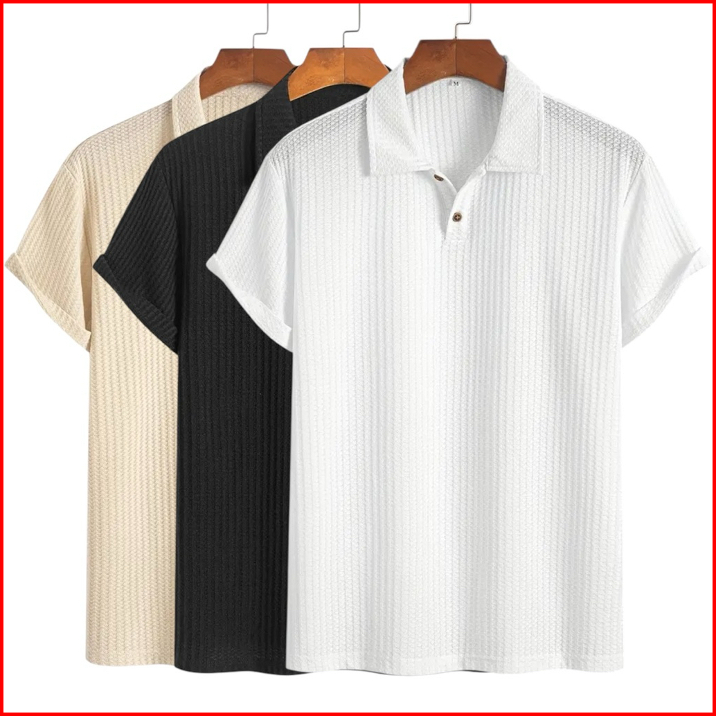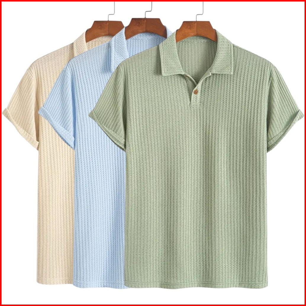 Paket 3 Pcs Kaos Polo Waffle Shirt Knit Pria Lengan Pendek Dengan Detail Berkancing Warna Solid Baju Kerah Pria Dewasa