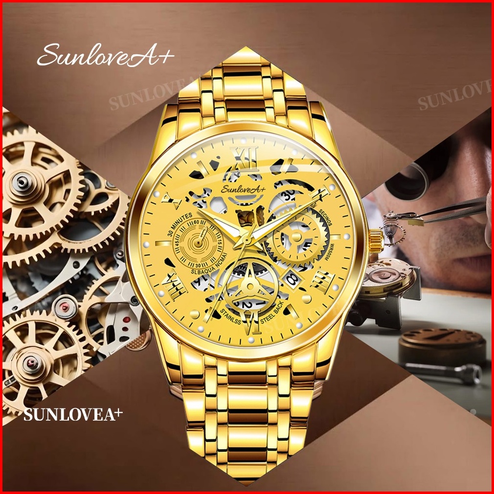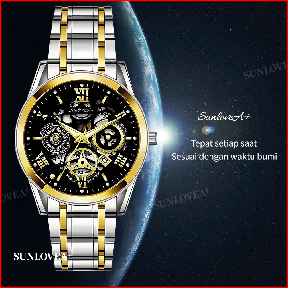 Sunlovea Tren Mode Premium Tahan Air Cahaya Malam Bisnis Otomatis Kuarsa Romawi Hollow Pria Jam Tangan