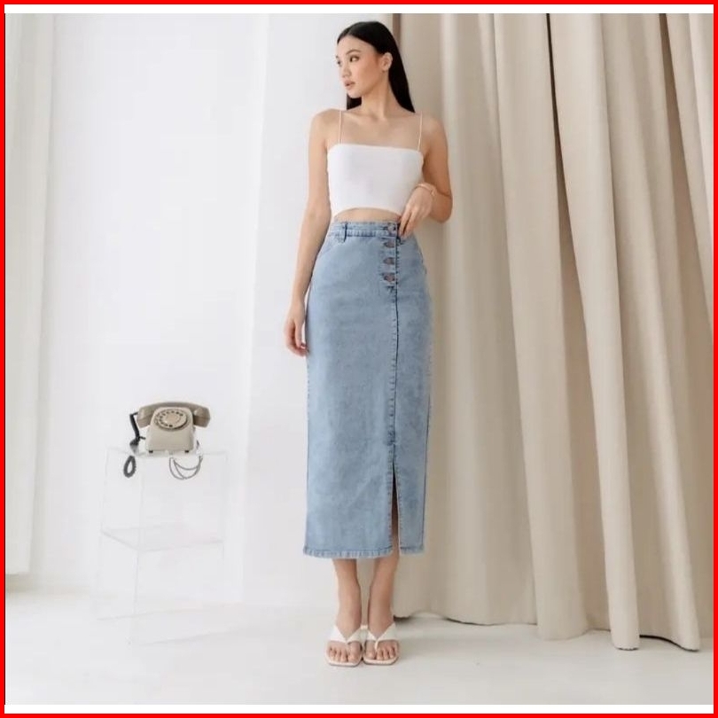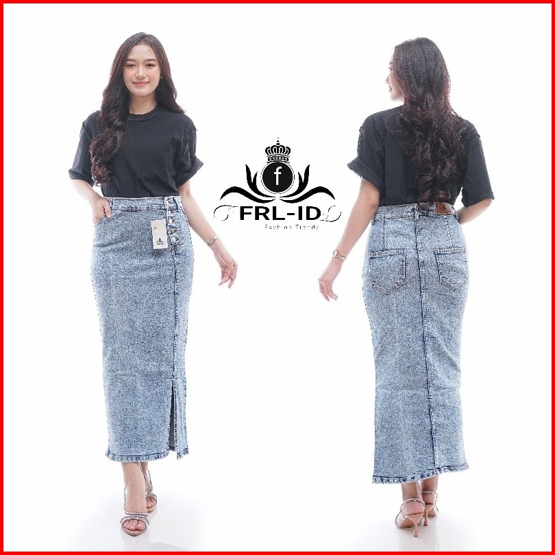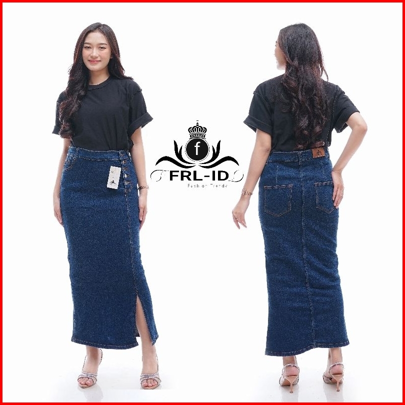 Frl-id Rok Denim Doremi Jeans Skirt - Rok Higwaist Panjang Belah Depan - Rok Jeans Jumbo Polos Model Kancing