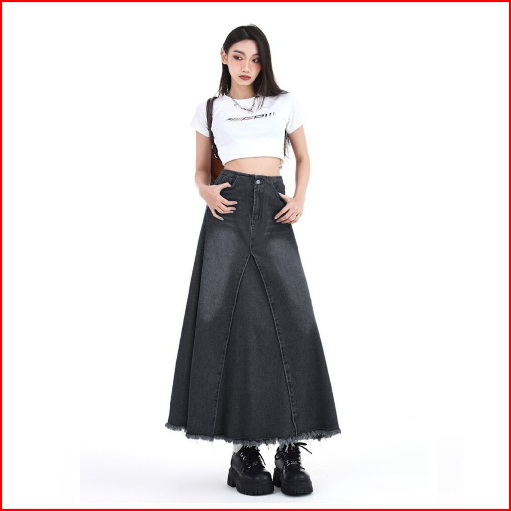 Pg Jeans - Rok Denim Vintage Retro Wanita Rok Jeans Panjang High Waist A-line Cewek