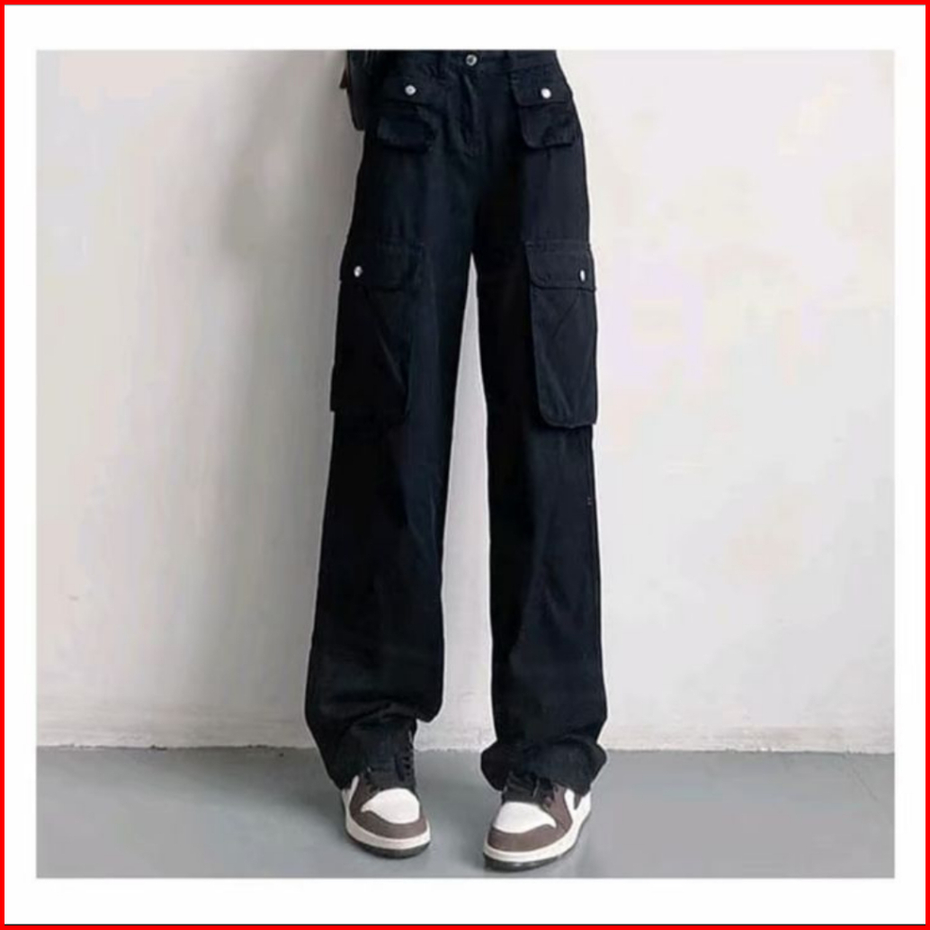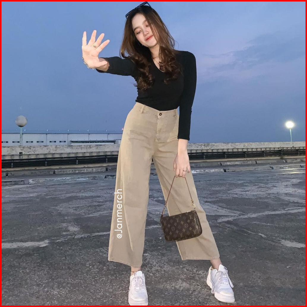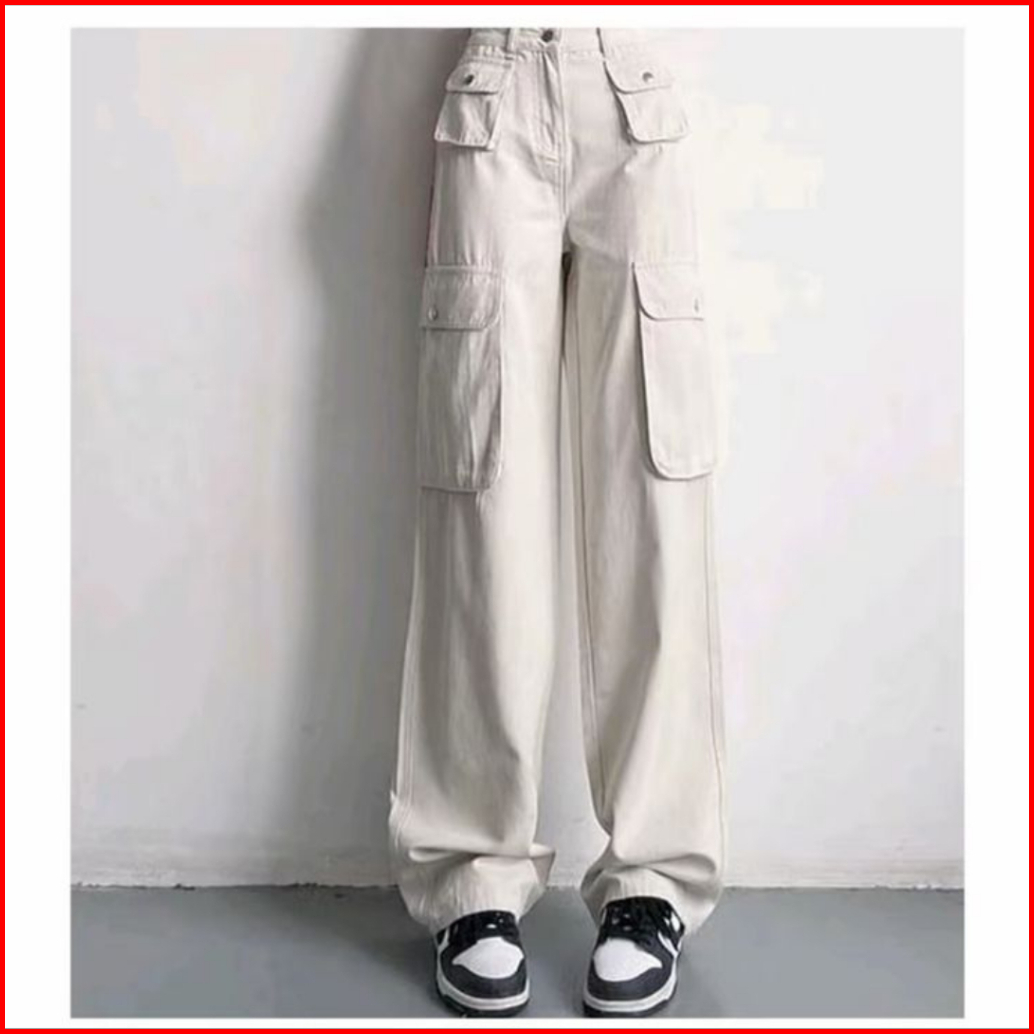 Celana Cargo Pasir Putih Highwaist Loose Celana Wanita Korea