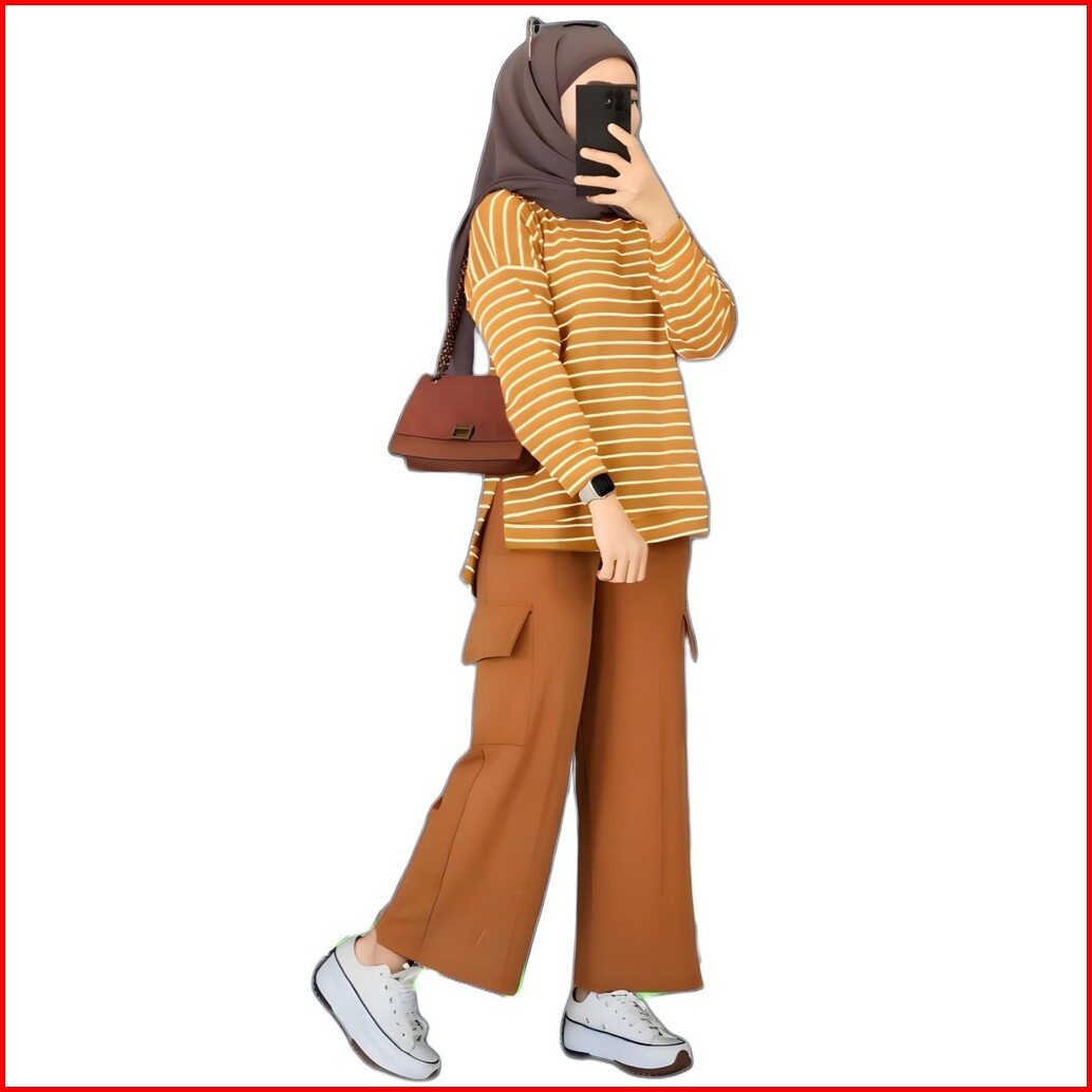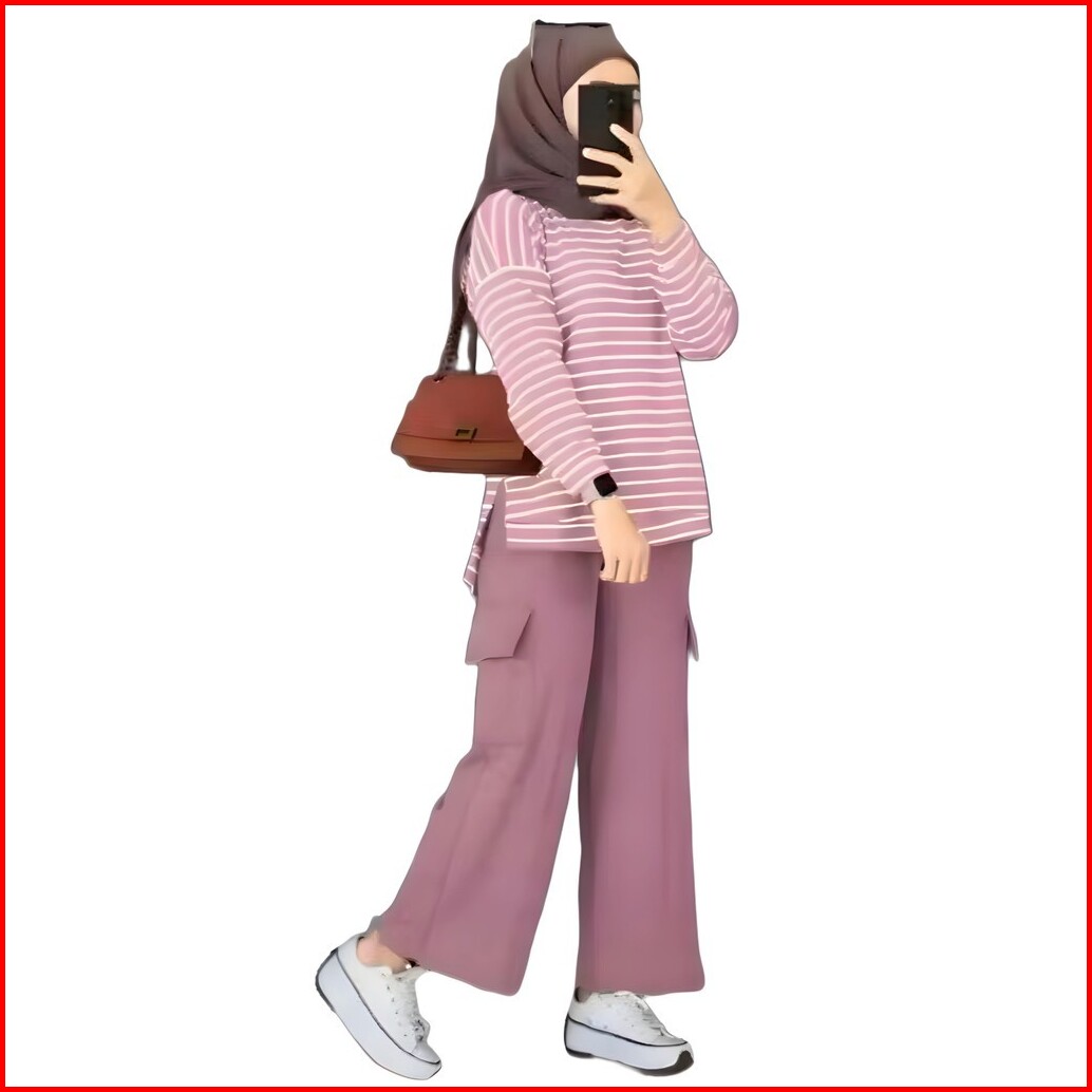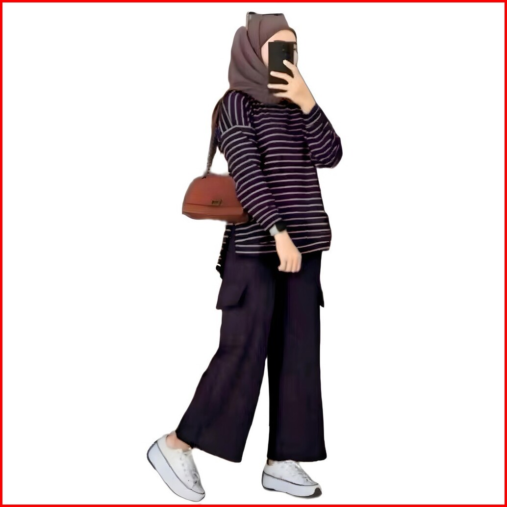 Setelan Rib Knit Celana Baju Atasan Wanita Dewasa Motif Garis