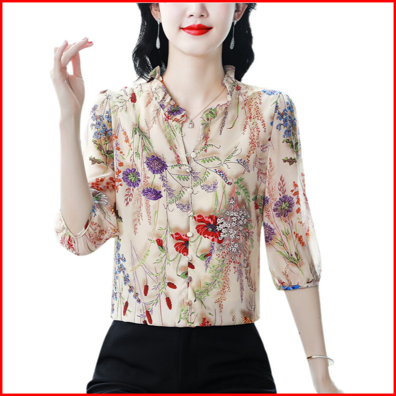 Bebovizi High Quality Apricot Chiffon Fabric Fashion Korean Style 3 4 Sleeve Blouse