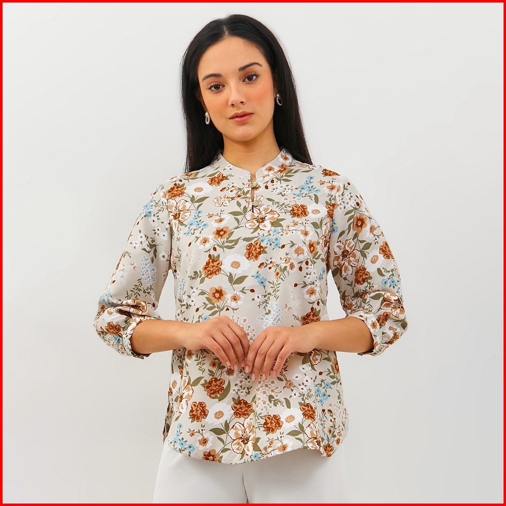 Simplicity Floral Print Smocked Cuff Blouse Atasan Blus Wanita Terbaru Casual Korean Style Kekinian Lengan Panjang Bahan