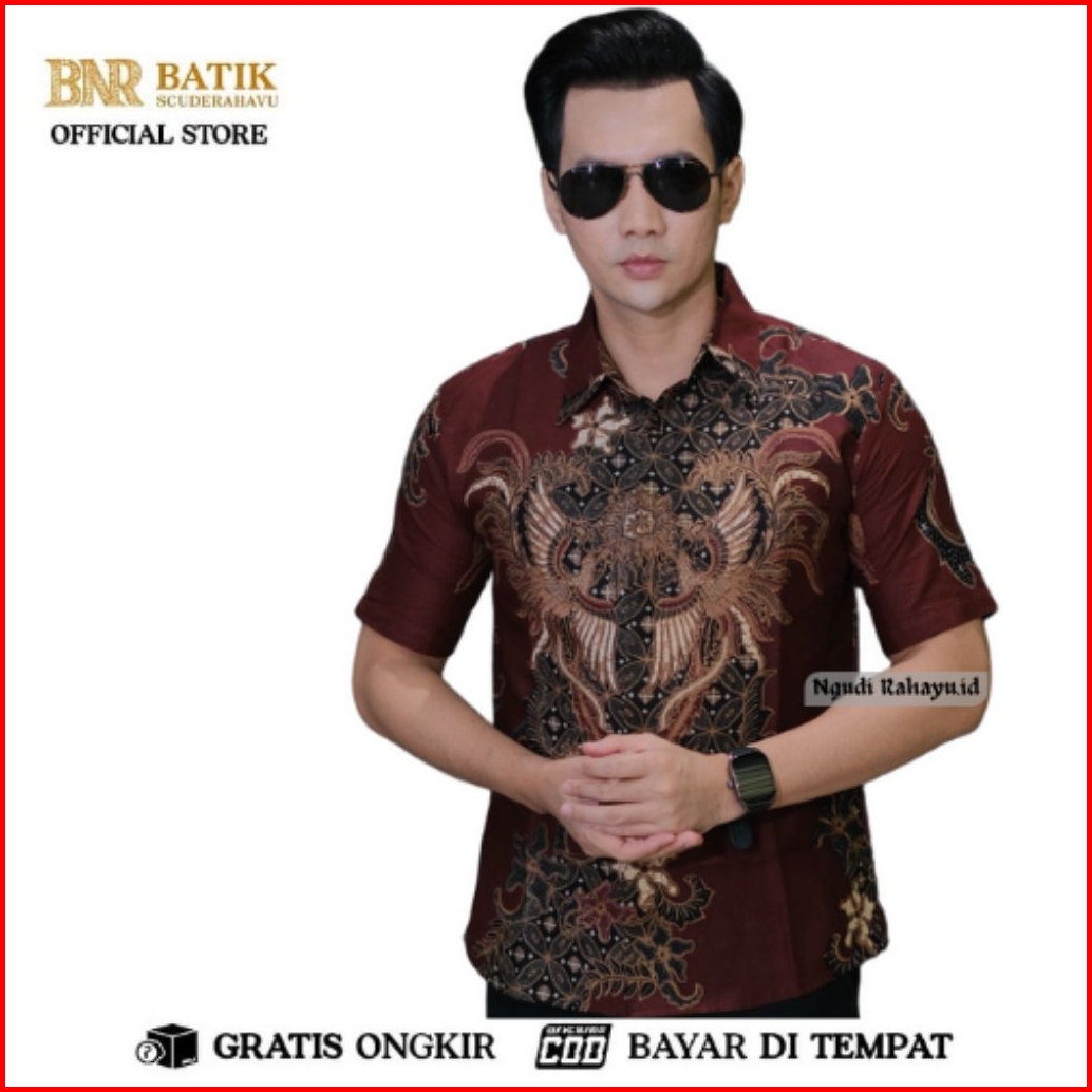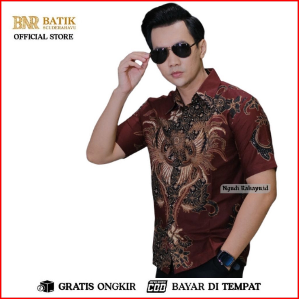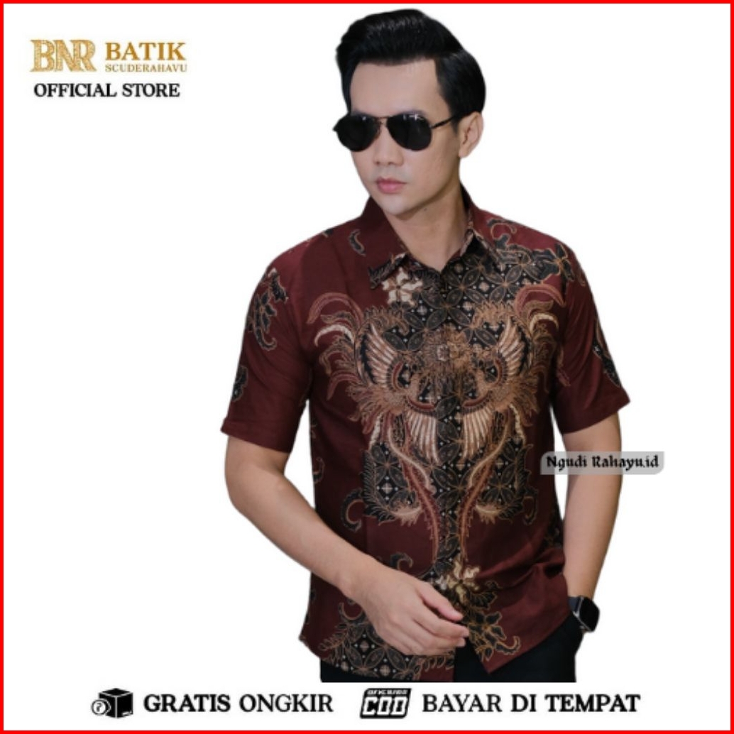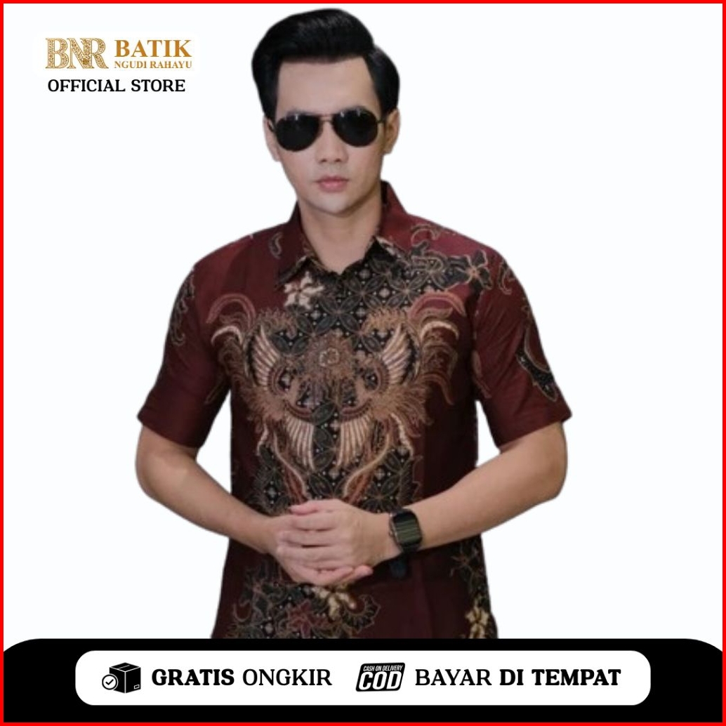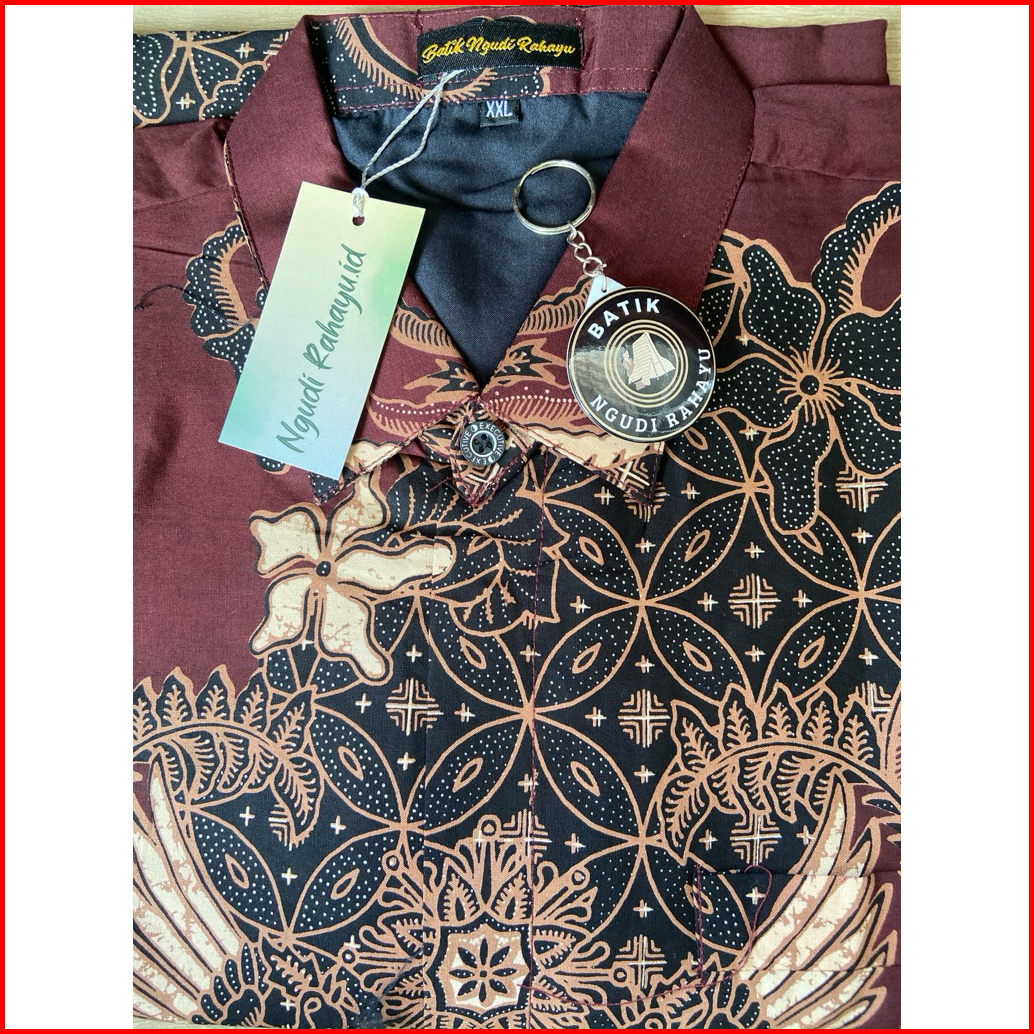 Ngudi Rahayu Kemeja Batik Pria Slimfit Lengan Pendek Motif Peksi Lasem Burgundi