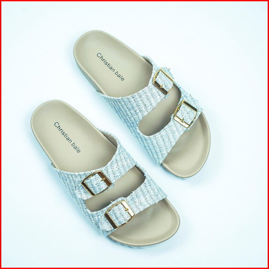 Christian Bale Lily Sandal Slop Wanita Kekinian Sendal Flat Kasual Cewek Selop Gesper Bahan Kain Keemasan Terbaru