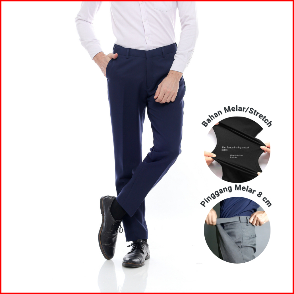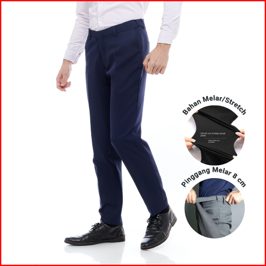 Bincoorank Celana Formal Bahan Melar Stretch Slim Fit Pria Pinggang Melar Warna Navy