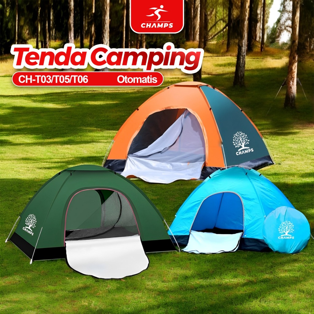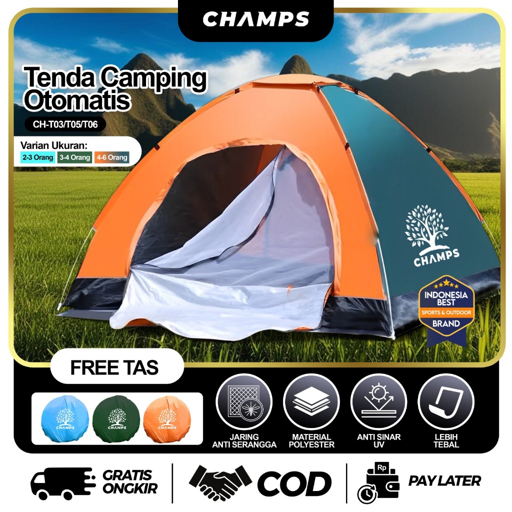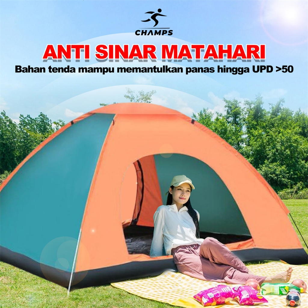 CHAMPS Tenda Otomatis Murah – Tenda Camping Anti Air + Tas, Lipat Praktis untuk 2–4 Orang + FREE TAS