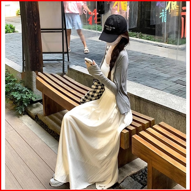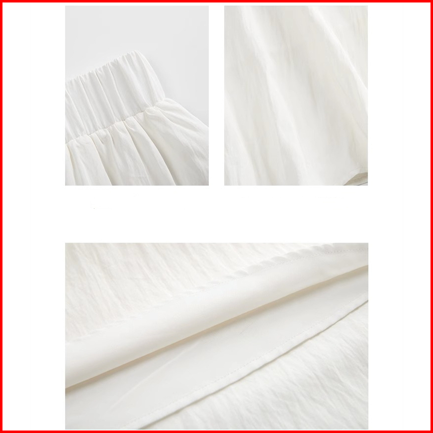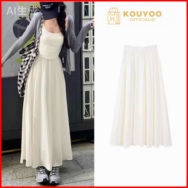 Kouyoo A-line Rok Rok Panjang Midi Payung Longgar Putih Kasual Tinggi Wanita Rok S M L Xl