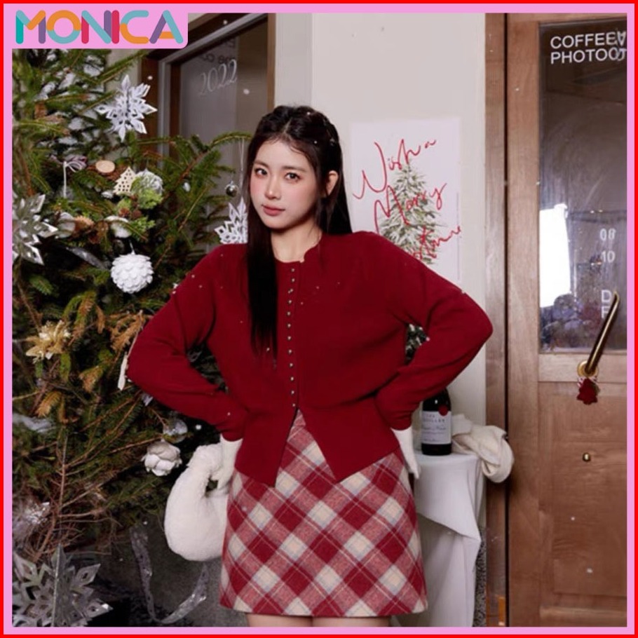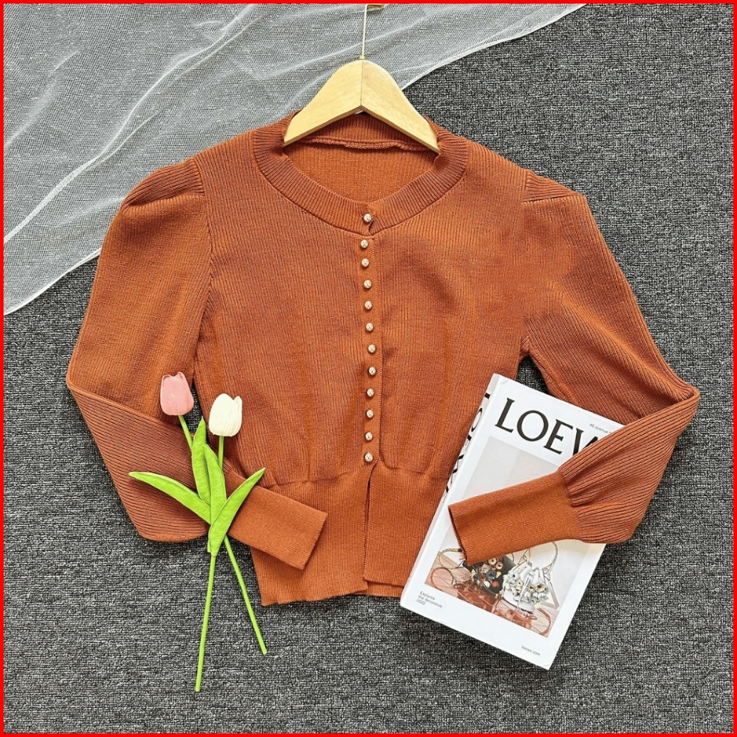 Monica Atasan Rajut Blouse Wanita Knitwear Kancing Pearl Round Neck Simple