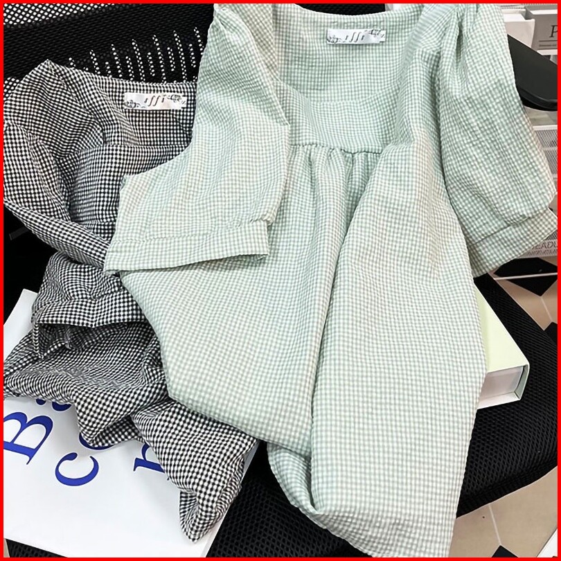 Air Swimwear Xf012 Blouse Korea Atasan Lengan Pendek Korean Style Puff Lengan Kemeja Kotak-kotak