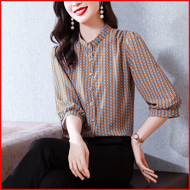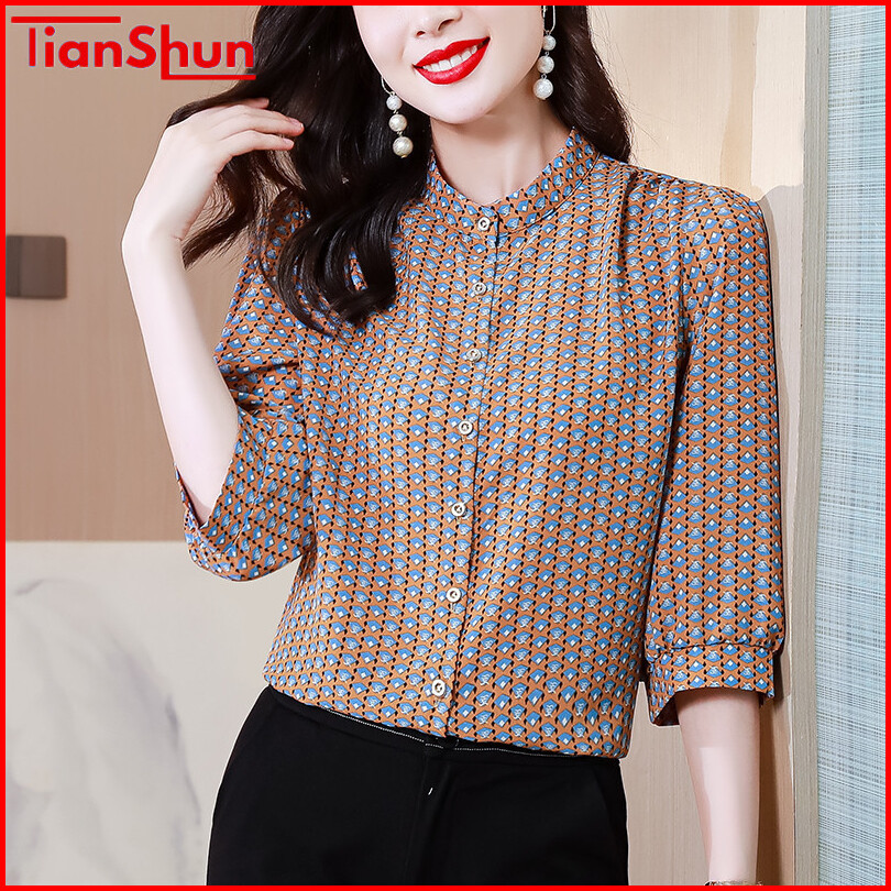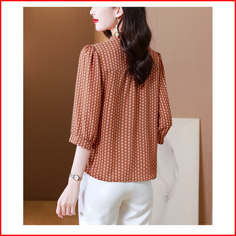 Tianshun Casual Women Floral Plaid Top 3 4 Sleeve V-neck Korean Shirt Blus Outfit Wanita Kekinian