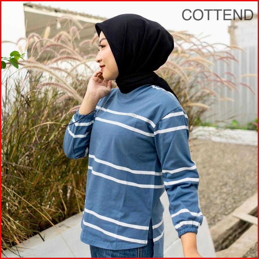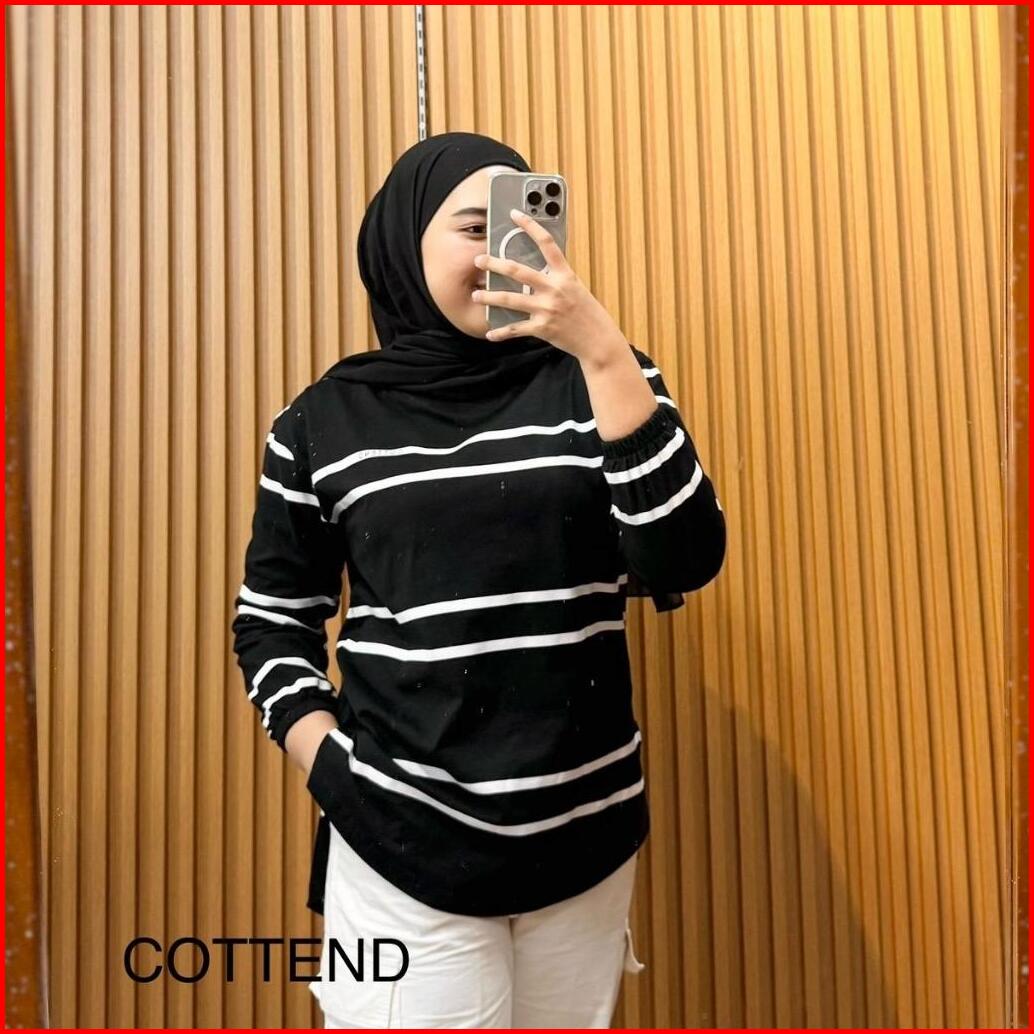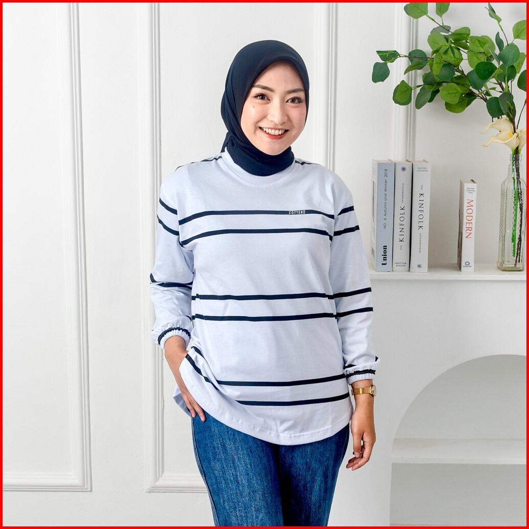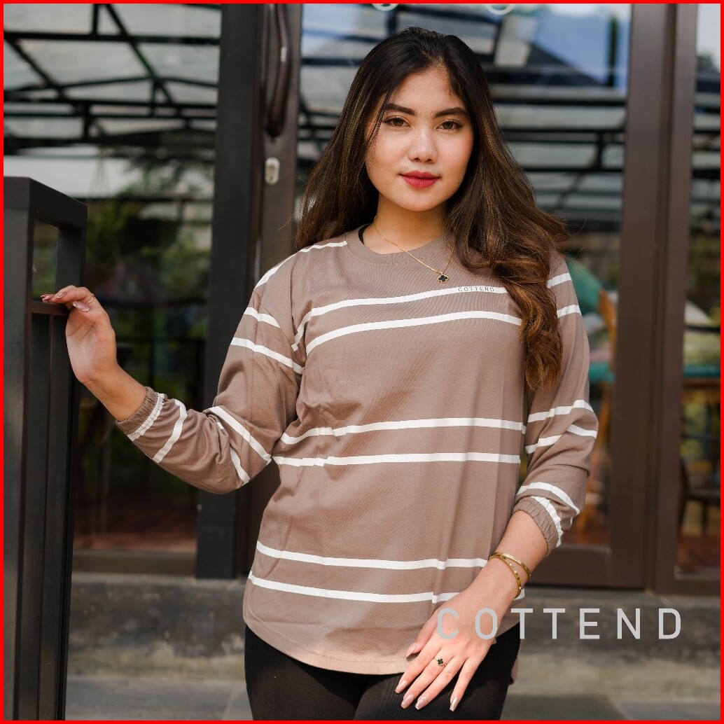 Cottend Stripe Atasan Kaos Wanita Oval Lengan Panjang Lengan Garis Bahan Katun Combed