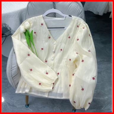 Kouyoo Gaya Istana Bordir Pinggang Lentera Lengan Kemeja Shifon Blus Lengan Panjang Retro Baju