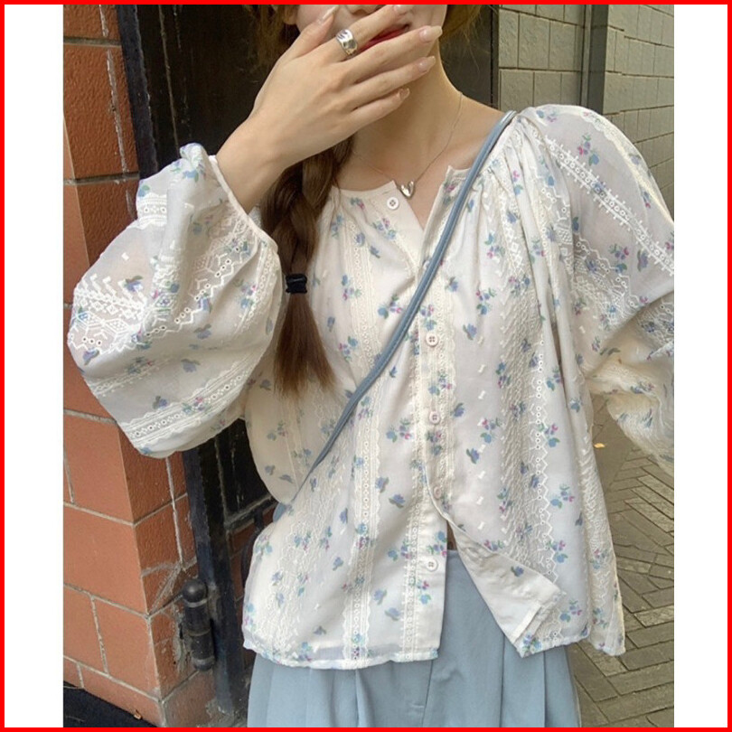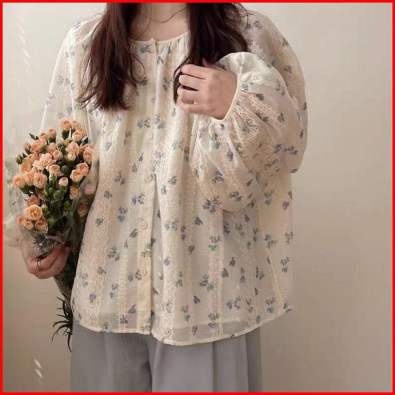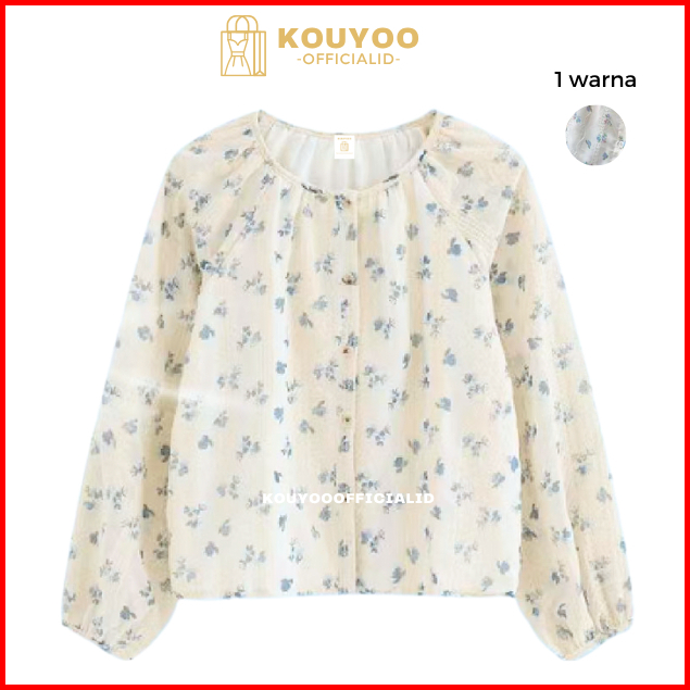 Kouyoo Kekinian Top Batik Wanita Blouse Bunga Atasan Wanita Korean Style Lengan Panjang Putih