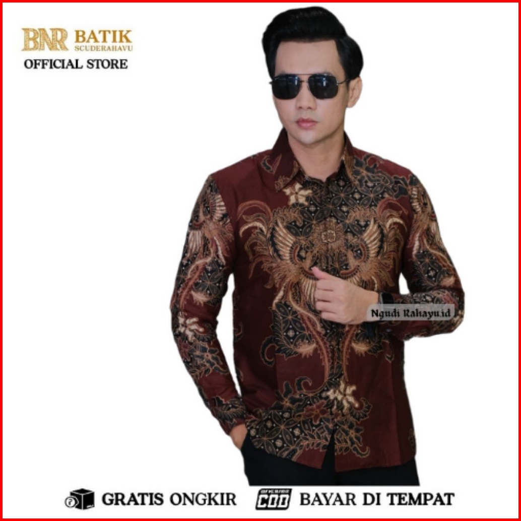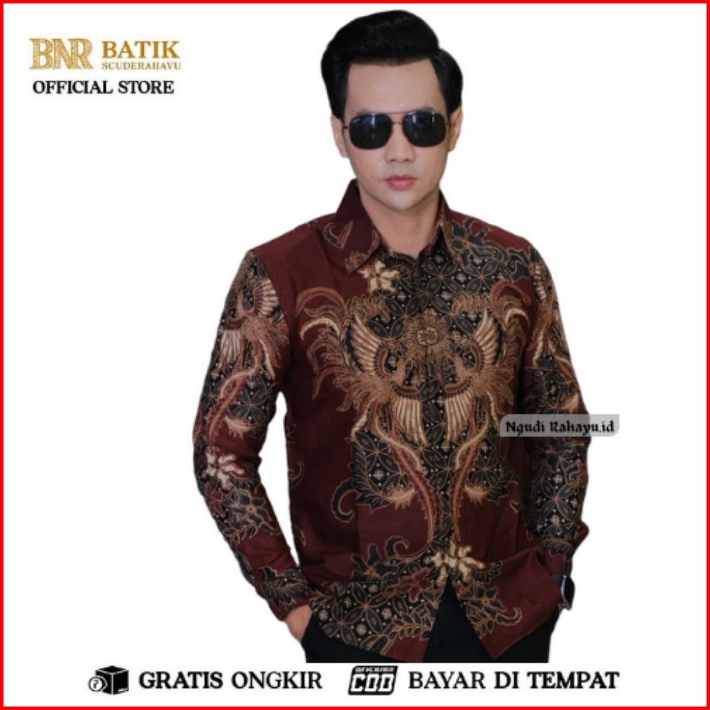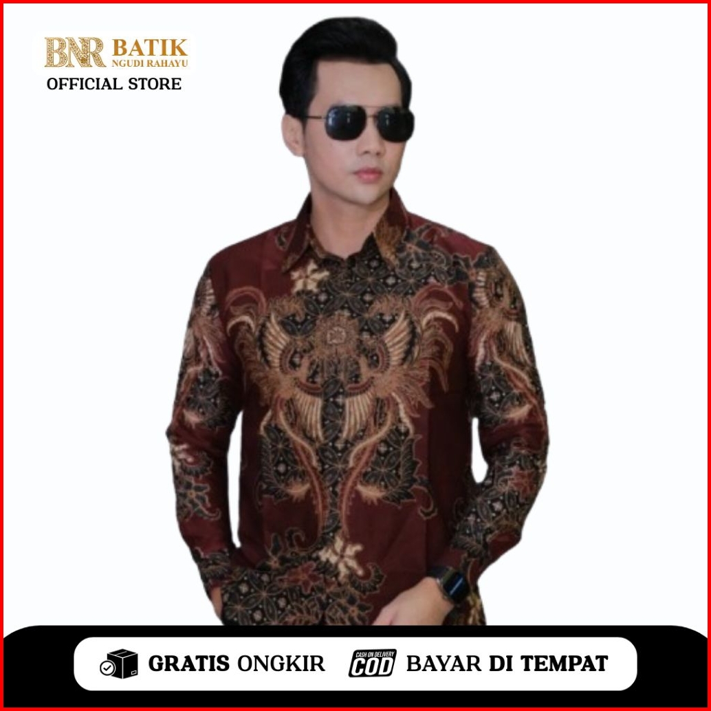 Ngudi Rahayu Kemeja Batik Slimfit Pria Lengan Panjang Motif Peksi Lasem Burgundi