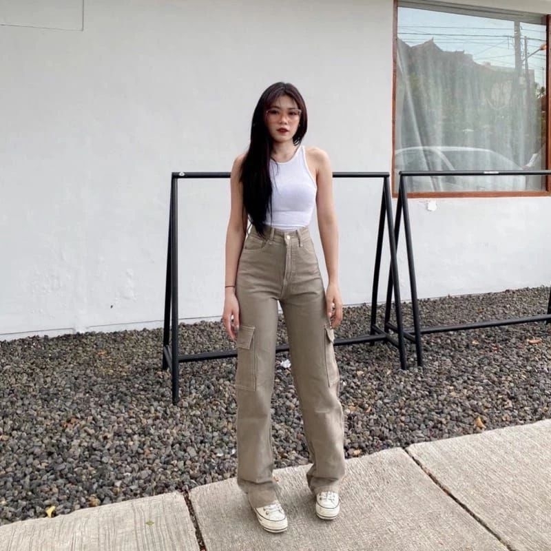 Yma Fashion - Celana Jeans Cargo Wanita - Hightwaist Celana Jeans Cargo