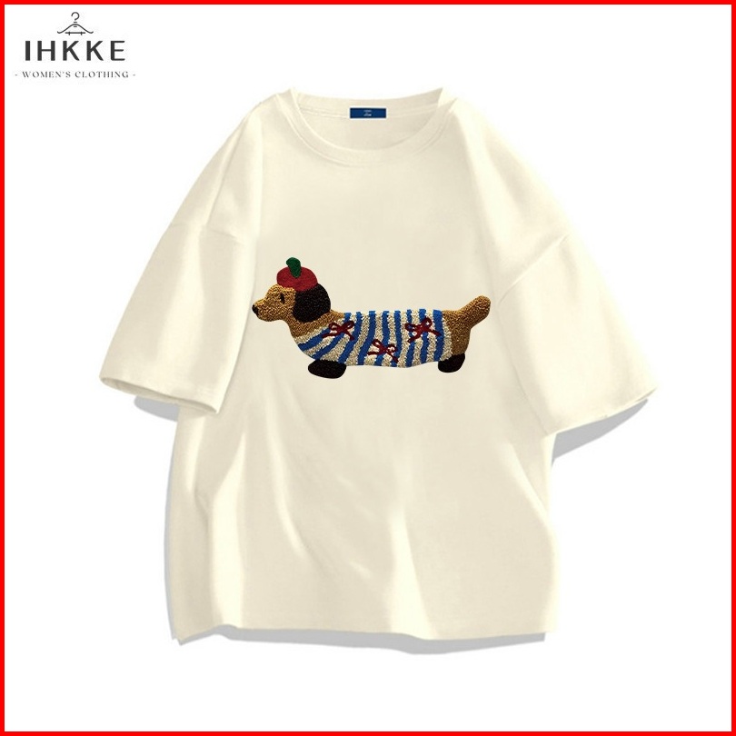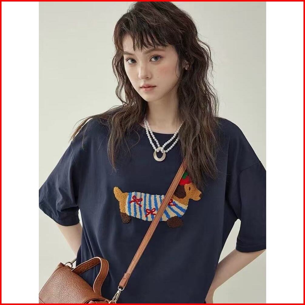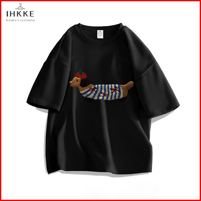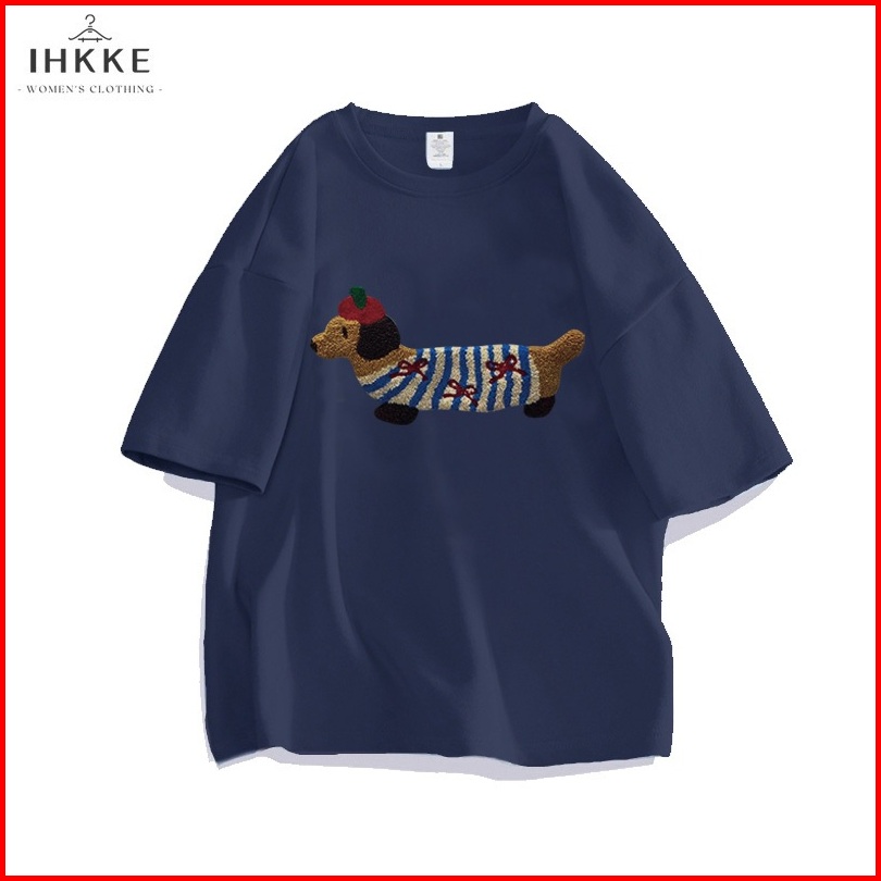 Ihkke Atasan Wanita Korea Style Kartun Lucu Anjing Dachshund Cetak Pola Navy Biru T Shirt Kaos 24s Cotton Combed Baju At