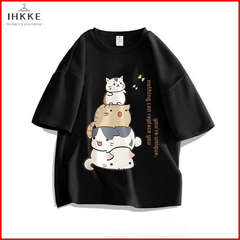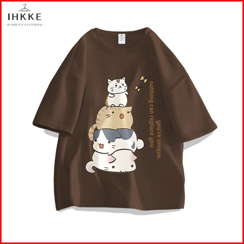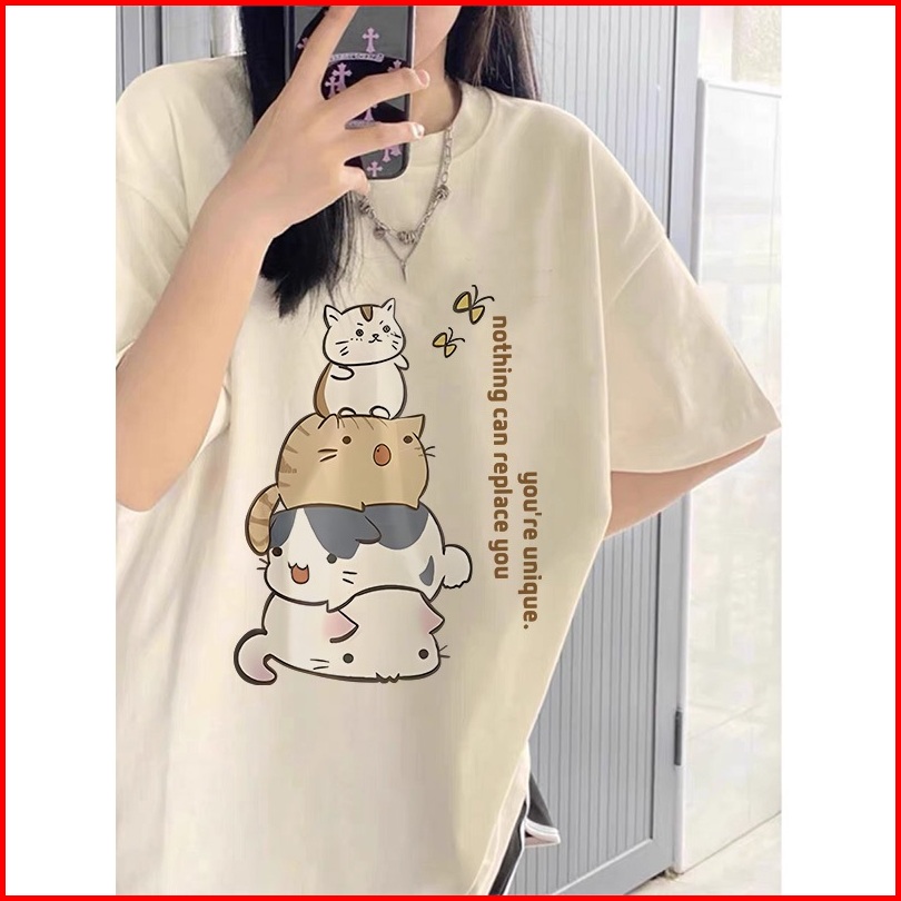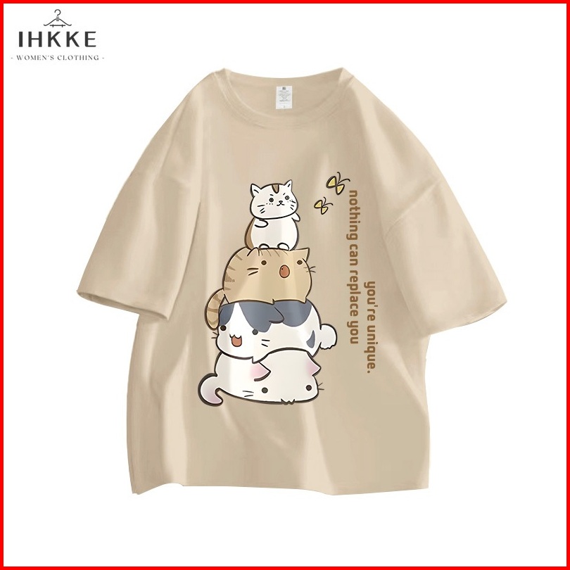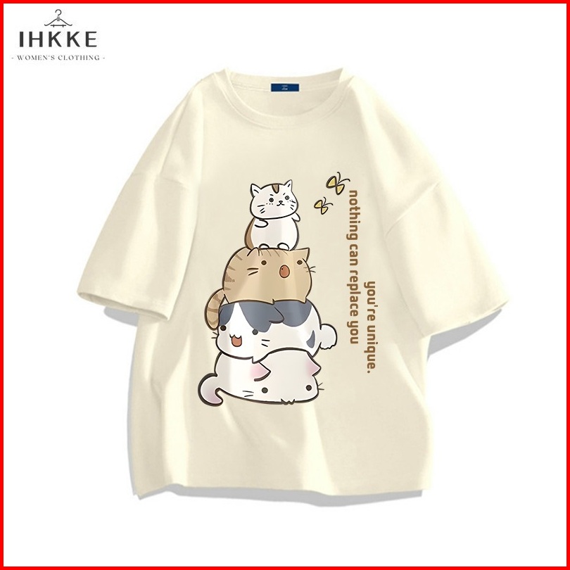 Ihkke Atasan Wanita Kekinian Cute Cartoon Cat Tower Butterfly Letter Pattern Graffiti Kaos Cream Lengan Pendek Kaos Over
